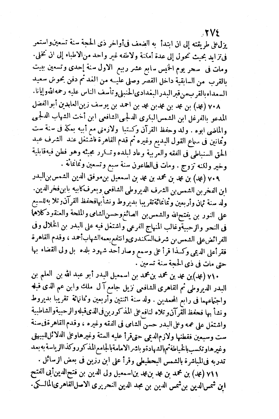 708 - مُحَمَّد بن مُحَمَّد بن مُحَمَّد بن مُحَمَّد بن أَحْمد بن يُوسُف زين العابدين أَبُو الْفضل الْمَدْعُو بالفرغل ابْن الشَّمْس الْبكْرِيّ الدلجي الشَّافِعِي ابْن أُخْت الشهَاب الدلجي / والماضي أَبوهُ.