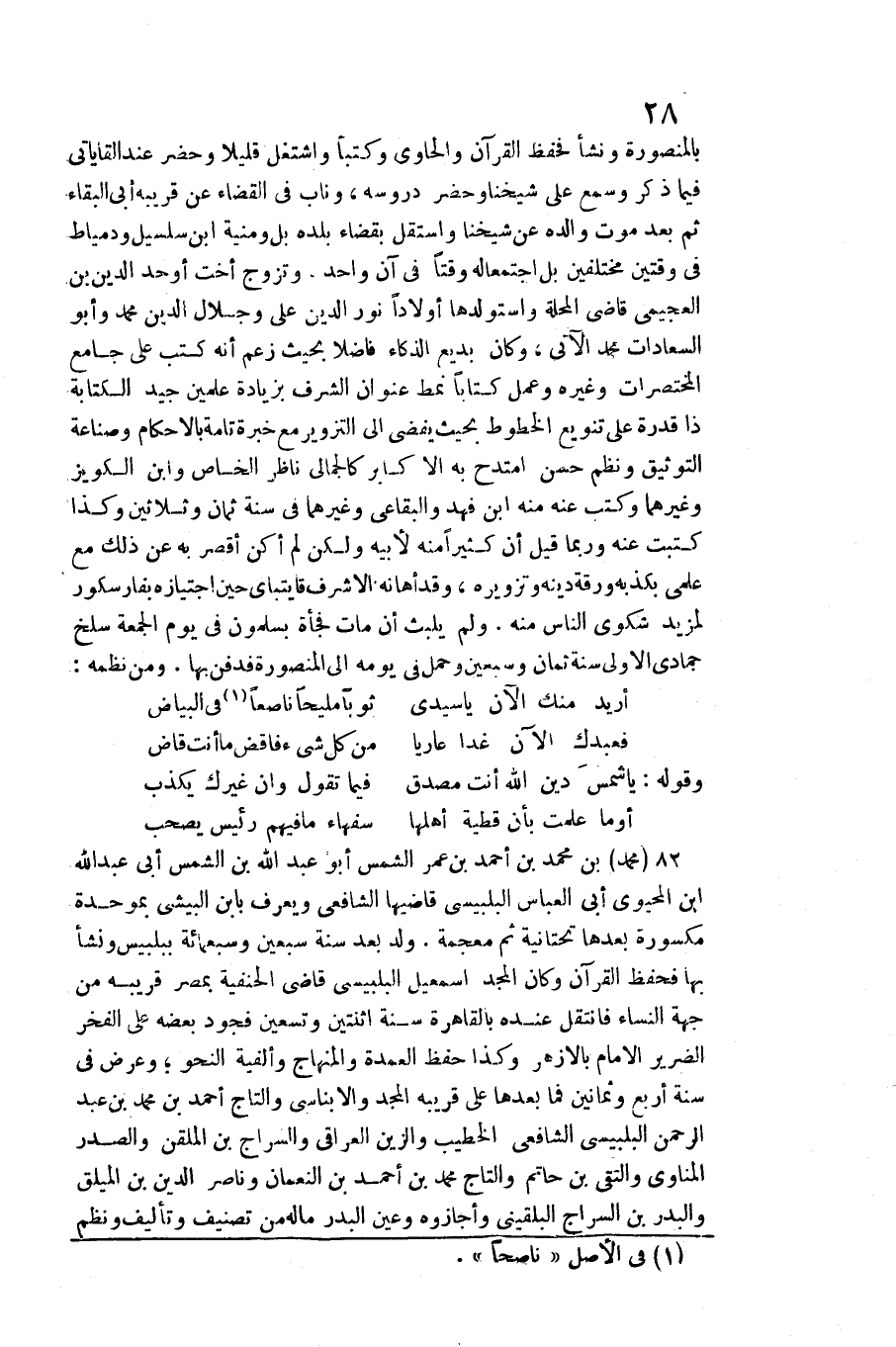82 - مُحَمَّد بن مُحَمَّد بن أَحْمد بن عمر الشَّمْس أَبُو عبد الله بن الشَّمْس أبي عبد الله ابْن المحيوي أبي الْعَبَّاس البلبيسي قاضيها الشَّافِعِي وَيعرف بِابْن البيشي بموحدة مَكْسُورَة بعْدهَا تَحْتَانِيَّة ثمَّ مُعْجَمه. / ولد بعد سنة سبعين وَسَبْعمائة ببلبيس وَنَشَأ بهَا فحفظ الْقُرْآن وَكَانَ الْمجد إِسْمَاعِيل البلبيسي قَاضِي الْحَنَفِيَّة بِمصْر قريبَة من جِهَة النِّسَاء فانتقل عِنْده بِالْقَاهِرَةِ سنة اثْنَتَيْنِ وَتِسْعين فجود بعضه على الْفَخر الضَّرِير الإِمَام بالأزهر وَكَذَا حفظ الْعُمْدَة والمنهاج وألفية النَّحْو، وَعرض فِي سنة أَربع وَثَمَانِينَ فَمَا بعْدهَا على قَرِيبه الْمجد والأبناسي والتاج أَحْمد بن مُحَمَّد بن عبد الرَّحْمَن البلبيسي الشَّافِعِي الْخَطِيب والزين الْعِرَاقِيّ والسراج بن الملقن والصدر الْمَنَاوِيّ والتقي بن حَاتِم والتاج مُحَمَّد بن أَحْمد بن النُّعْمَان وناصر الدّين بن الميلق والبدر بن السراج البُلْقِينِيّ وأجازوه وَعين الْبَدْر مَاله من تصنيف وتأليف ونظم