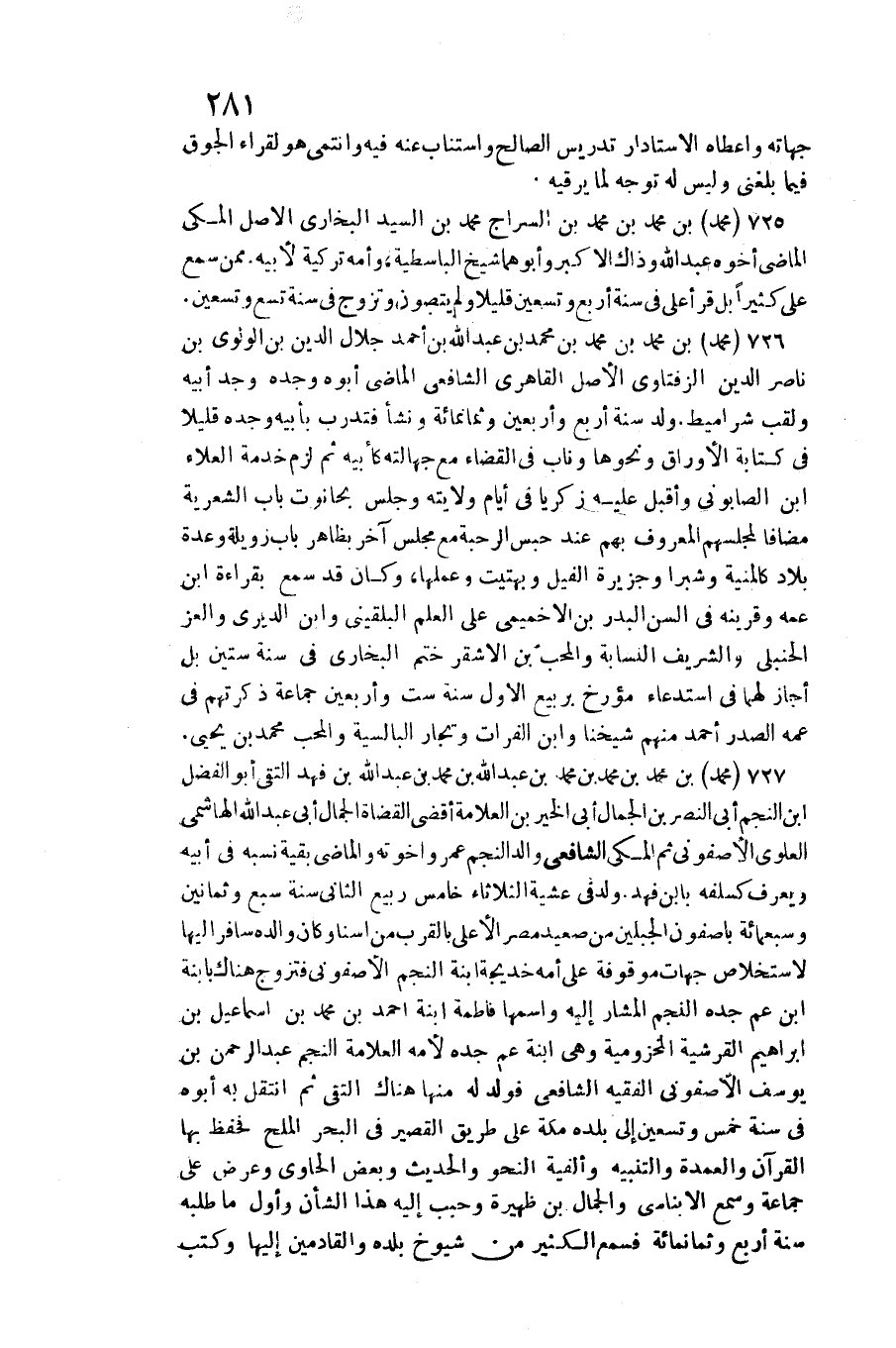 727 - مُحَمَّد بن مُحَمَّد بن مُحَمَّد بن مُحَمَّد بن عبد الله بن مُحَمَّد بن عبد الله بن فَهد التقي أَبُو الْفضل بن النَّجْم أبي النَّصْر بن الْجمال أبي الْخَيْر بن الْعَلامَة أقضى الْقُضَاة الْجمال أبي عبد الله الْهَاشِمِي الْعلوِي الأصفوني ثمَّ الْمَكِّيّ الشَّافِعِي وَالِد النَّجْم عمر وَإِخْوَته والماضي بَقِيَّة نسبه فِي أَبِيه وَيعرف كسلفه بِابْن فَهد. / ولد فِي عَشِيَّة الثُّلَاثَاء خَامِس ربيع الثَّانِي سنة سبع وَثَمَانِينَ وَسَبْعمائة بأصفون الجبلين من صَعِيد مصر الْأَعْلَى بِالْقربِ من أسنا وَكَانَ وَالِده سَافر إِلَيْهَا لاستخلاص جِهَات مَوْقُوفَة على أمه خَدِيجَة ابْنة النَّجْم الأصفوني فَتزَوج هُنَاكَ بابنة ابْن عَم جده النَّجْم الْمشَار إِلَيْهِ وَاسْمهَا فَاطِمَة ابْنة أَحْمد بن مُحَمَّد بن إِسْمَاعِيل بن إِبْرَاهِيم القرشية المخزومية وَهِي ابْنة عَم جده لأمه الْعَلامَة النَّجْم عبد الرَّحْمَن بن يُوسُف الأصفوني الْفَقِيه الشَّافِعِي فولد لَهُ مِنْهَا هُنَاكَ التقي ثمَّ انْتقل بِهِ أَبوهُ فِي سنة خمس وَتِسْعين إِلَى بَلَده مَكَّة على طَرِيق الْقصير فِي الْبَحْر الْملح فحفظ بهَا الْقُرْآن والعمدة والتنبيه وألفية النَّحْو والْحَدِيث وَبَعض الْحَاوِي وَعرض على جمَاعَة وَسمع الأبناسي وَالْجمال بن ظهيرة وحبب إِلَيْهِ هَذَا الشَّأْن وَأول مَا طلبه سنة أَربع وَثَمَانمِائَة فَسمع الْكثير من شُيُوخ بَلَده والقادمين إِلَيْهَا وَكتب
