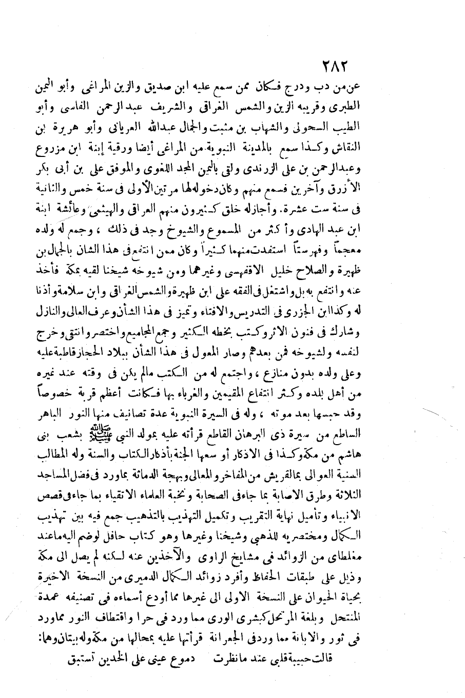 عِنْد غَيره من أهل بَلَده وَكثر انْتِفَاع المقيمين والغرباء بهَا فَكَانَت أعظم قربَة خُصُوصا وَقد حَبسهَا بعد مَوته، وَله فِي السِّيرَة النَّبَوِيَّة عدَّة تصانيف مِنْهَا النُّور الباهر الساطع من سيرة ذِي الْبُرْهَان الْقَاطِع قرأته عَلَيْهِ بمولد النَّبِي صلى الله عَلَيْهِ وَسلم بشعب بني هَاشم من مَكَّة وَكَذَا فِي الْأَذْكَار أوسعها الْجنَّة بأذكار الْكتاب وَالسّنة وَله المطالب السّنيَّة العوالي بِمَا لقريش من المفاخر والمعالي وبهجة الدماثة بِمَا ورد فِي فضل الْمَسَاجِد الثَّلَاثَة وطرق الْإِصَابَة بِمَا جَاءَ فِي الصَّحَابَة ونخبة الْعلمَاء الأتقياء بِمَا جَاءَ فِي قصَص الْأَنْبِيَاء وتأميل نِهَايَة التَّقْرِيب وتكميل التذهيب بالتذهيب جمع فِيهِ بَين تَهْذِيب الْكَمَال ومختصريه للذهبي وَشَيخنَا وَغَيرهَا وَهُوَ كتاب حافل لَو ضم إِلَيْهِ مَا عِنْد مغلطاي من الزَّوَائِد فِي مَشَايِخ الرَّاوِي والآخذين عَنهُ لكنه لم يصل إِلَى مَكَّة وذيل على طَبَقَات الْحفاظ وأفرد زَوَائِد الْكَمَال الدَّمِيرِيّ من النُّسْخَة الْأَخِيرَة بحياة الْحَيَوَان على النُّسْخَة الأولى إِلَى غَيرهَا مِمَّا أودع أسماءه فِي تصنيفه عُمْدَة الْمُنْتَحل وبلغه المرتجل كبشرى الورى مِمَّا ورد فِي حرا واقتطاف النُّور مِمَّا ورد فِي ثَوْر والإبانة مَا ورد فِي الْجِعِرَّانَة قرأتها عَلَيْهِ بمحالها من مَكَّة وَله بيتان وهما: