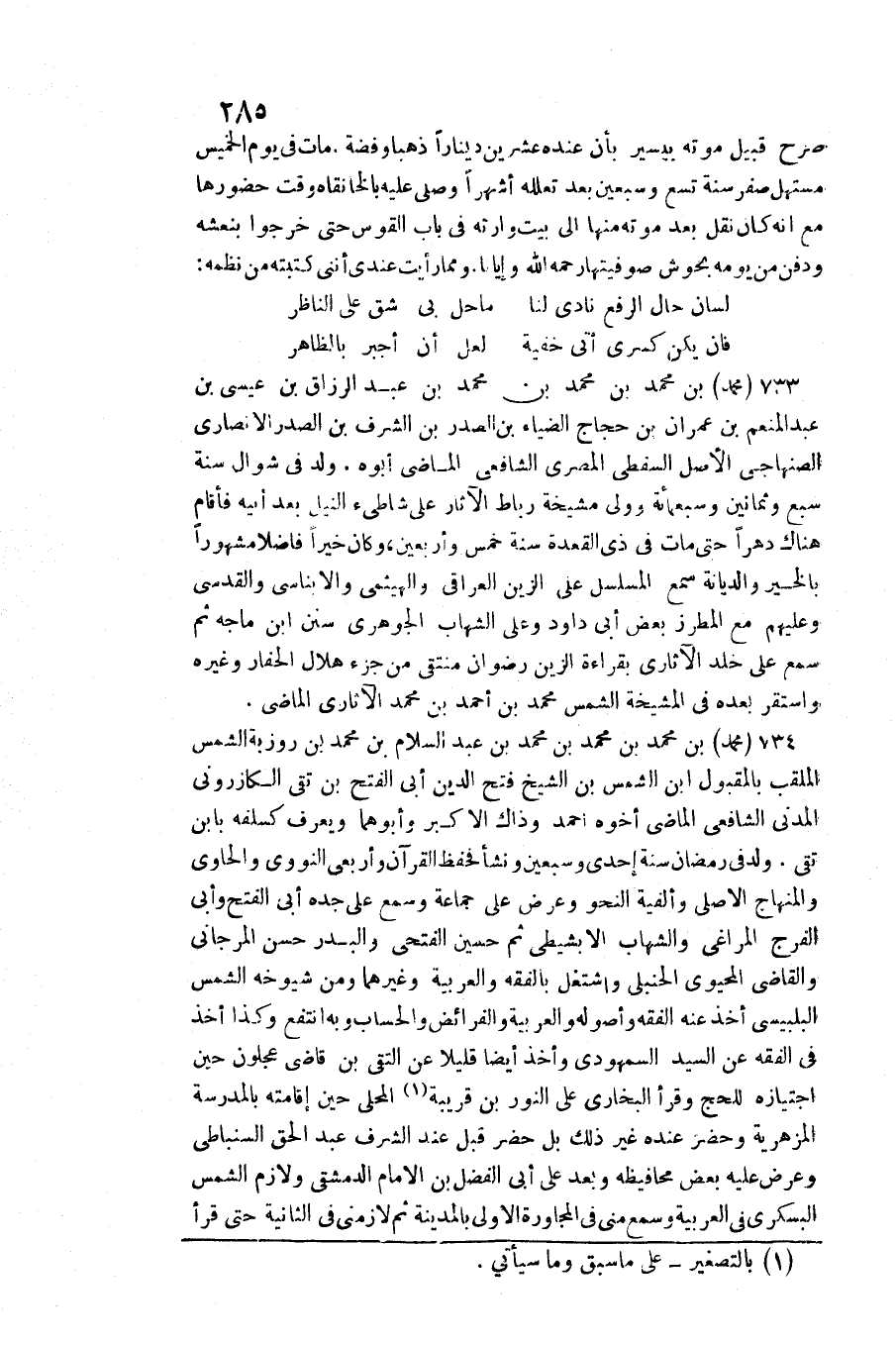 733 - مُحَمَّد بن مُحَمَّد بن مُحَمَّد بن مُحَمَّد بن عبد الرَّزَّاق بن عِيسَى بن عبد الْمُنعم بن عمرَان بن حجاج الضياء بن الصَّدْر بن الشّرف بن الصَّدْر الْأنْصَارِيّ الصنهاجي الأَصْل السفطي الْمصْرِيّ الشَّافِعِي / الْمَاضِي أَبوهُ. ولد فِي شَوَّال سنة سبع وَثَمَانِينَ وَسَبْعمائة وَولي مشيخة رِبَاط الْآثَار على شاطئ النّيل بعد أَبِيه فَأَقَامَ هُنَاكَ دهرا حَتَّى مَاتَ فِي ذِي الْقعدَة سنة خمس وَأَرْبَعين، وَكَانَ خيرا فَاضلا مَشْهُورا بِالْخَيرِ والديانة سمع المسلسل على الزين الْعِرَاقِيّ والهيثمي والأبناسي والقدسي وَعَلَيْهِم مَعَ الْمُطَرز بعض أبي دَاوُد وعَلى الشهَاب الْجَوْهَرِي سنَن ابْن ماجة ثمَّ سمع على خلد الآثاري بِقِرَاءَة الزين رضوَان منتقى من جُزْء هِلَال الحفار وَغَيره وَاسْتقر بعده فِي المشيخة الشَّمْس مُحَمَّد بن أَحْمد بن مُحَمَّد الآثاري الْمَاضِي.