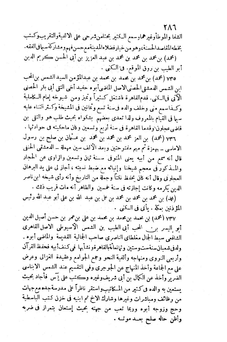 735 - مُحَمَّد بن مُحَمَّد بن مُحَمَّد بن مُحَمَّد بن عبد الْمُؤمن السَّيِّد الشَّمْس بن الْمُحب بن الشَّمْس الدِّمَشْقِي الحصني الأَصْل الْمَاضِي أَبوهُ حفيد أخي التقي أبي بكر الحصني / الْآتِي فِي الكنى. قدم الْقَاهِرَة فاشتغل كثيرا وتميز وَمن شُيُوخه إِمَام الكاملية وَكَذَا سمع مني وَخلف وَالِده)