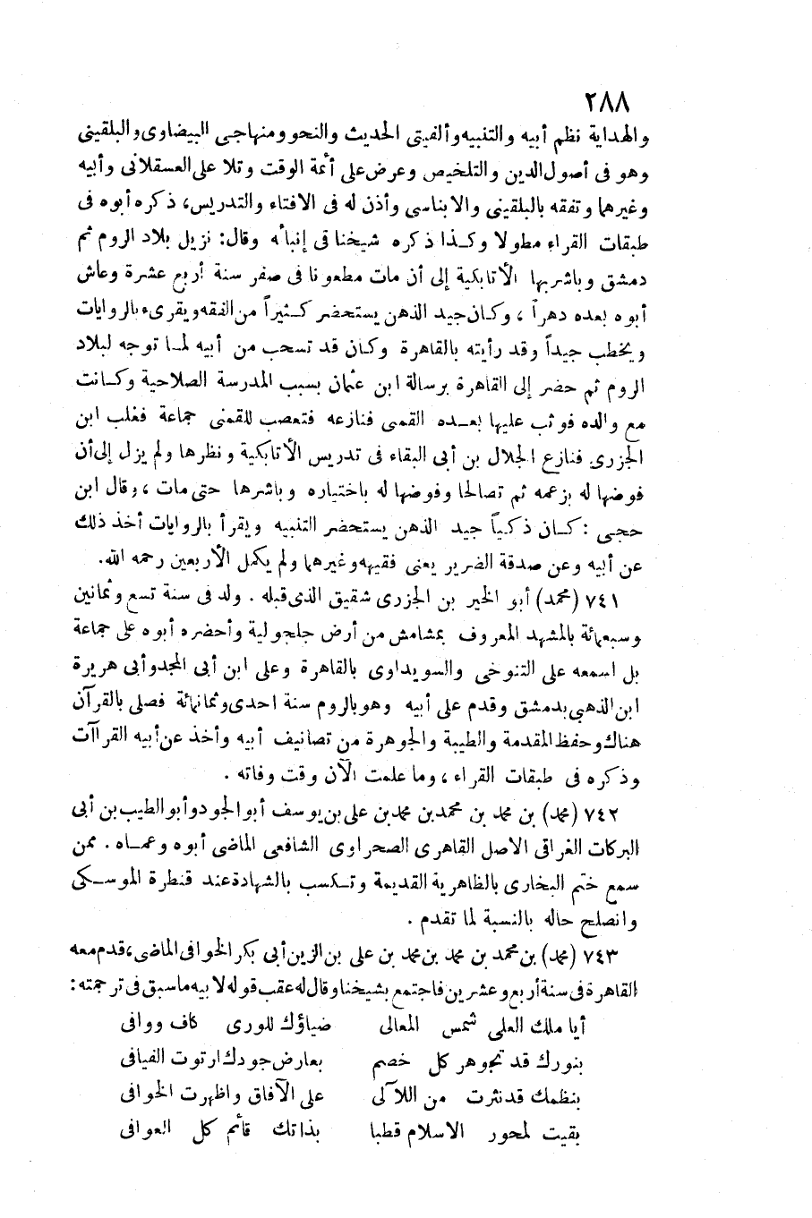 741 - مُحَمَّد أَبُو الْخَيْر بن الْجَزرِي / شَقِيق الَّذِي قبله. ولد فِي سنة تسع وَثَمَانِينَ وَسَبْعمائة بالمشهد الْمَعْرُوف بمشامش من أَرض جلجولية وأحضره أَبوهُ على جمَاعَة بل أسمعهُ على التنوخي والسويداوي بِالْقَاهِرَةِ وعَلى ابْن أبي الْمجد وَأبي هُرَيْرَة بن الذَّهَبِيّ بِدِمَشْق وَقدم على أَبِيه وَهُوَ بالروم سنة إِحْدَى وَثَمَانمِائَة فصلى بِالْقُرْآنِ هُنَاكَ وَحفظ الْمُقدمَة والطيبة والجوهرة من تصانيف أَبِيه وَأخذ عَن أَبِيه القراآت وَذكره فِي طَبَقَات الْقُرَّاء، وَمَا علمت الْآن وَقت وَفَاته.