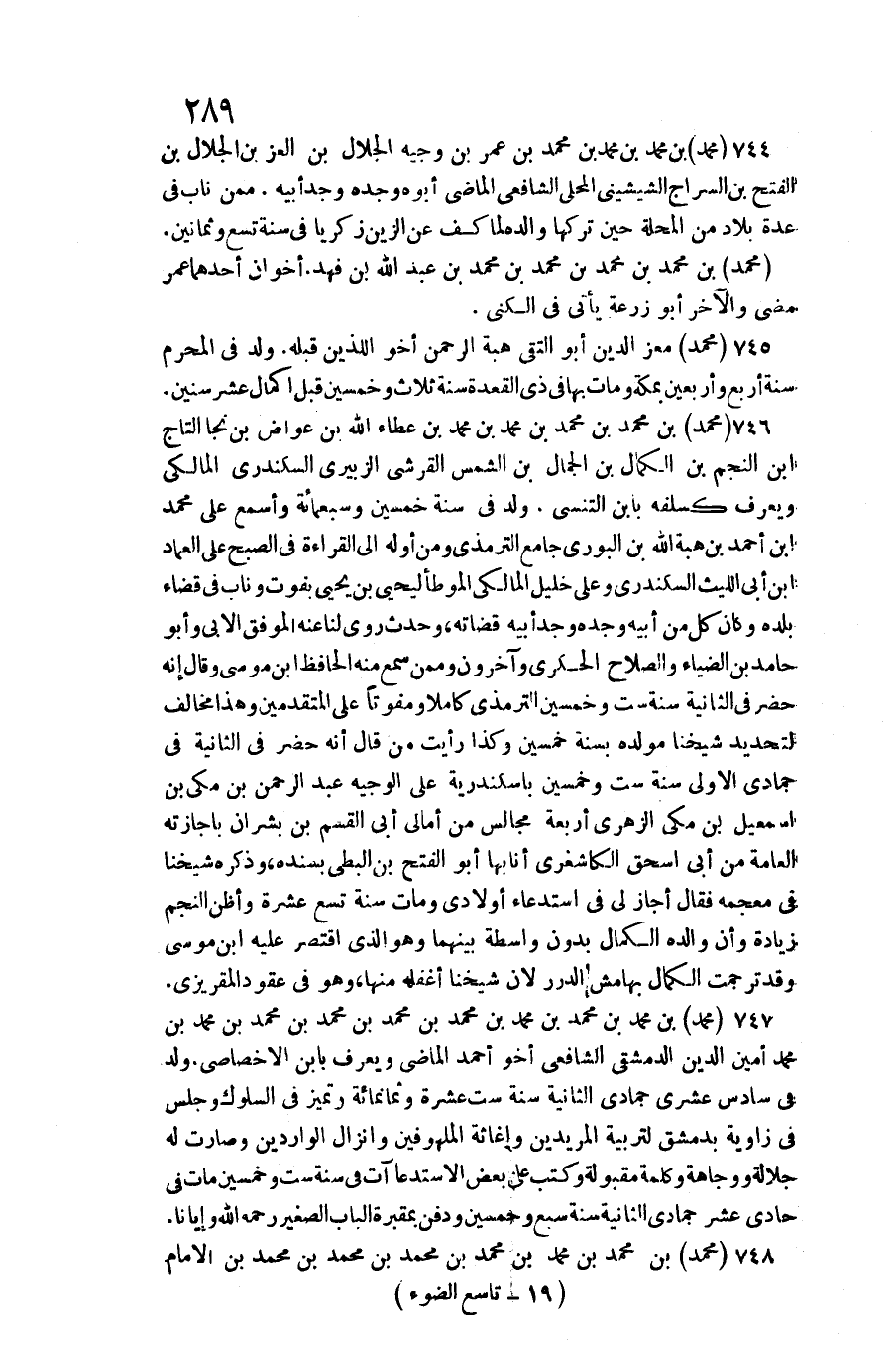 744 - مُحَمَّد بن مُحَمَّد بن مُحَمَّد بن مُحَمَّد بن عمر بن وجيه الْجلَال بن الْعِزّ بن الْجلَال بن الْفَتْح بن السراج الشيشيني الْمحلي الشَّافِعِي / الْمَاضِي أَبوهُ وجده وجد أَبِيه. مِمَّن نَاب فِي عدَّة بِلَاد من الْمحلة حِين تَركهَا وَالِده لما كف عَن الزين زَكَرِيَّا فِي سنة تسع وَثَمَانِينَ.