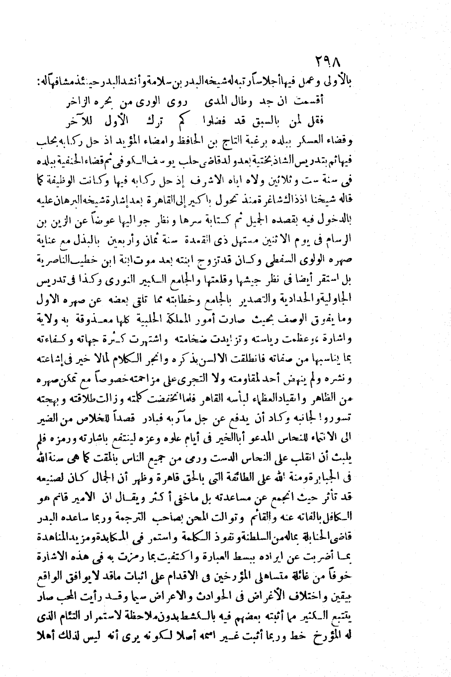 وَقَضَاء الْعَسْكَر بِبَلَدِهِ برغبة التَّاج بن الْحَافِظ وإمضاء الْمُؤَيد إِذْ حل ركابه بحلب فِيهَا ثمَّ بتدريس الشاذبختية بعد ولد قَاضِي حلب يُوسُف الْكُوفِي ثمَّ قَضَاء الْحَنَفِيَّة بِبَلَدِهِ فِي سنة سِتّ وَثَلَاثِينَ ولاه إِيَّاه الْأَشْرَف إِذْ حل ركابه فِيهَا وَكَانَت الْوَظِيفَة كَمَا قَالَه شَيخنَا إِذْ ذَاك شاغرة مُنْذُ تحول باكير إِلَى الْقَاهِرَة بعد إِشَارَة شَيْخه الْبُرْهَان عَلَيْهِ بِالدُّخُولِ فِيهِ بِقَصْدِهِ الْجَمِيل ثمَّ كِتَابَة سرها وَنظر جوالها عوضا عَن الزين بن الرسام فِي يَوْم الِاثْنَيْنِ مستهل ذِي الْقعدَة سنة ثَمَان وَأَرْبَعين بالبذل مَعَ عناية صهره الولوي السفطي وَكَانَ قد تزوج ابْنَته بعد موت ابْنة ابْن خطيب الناصرية بل اسْتَقر أَيْضا فِي نظر جيشها وقلعتها وَالْجَامِع الْكَبِير النوري وَكَذَا فِي تدريس الجاولية والحدادية والتصدير بالجامع وخطابته مِمَّا تلقى بعضه عَن صهره الأول وَمَا يفوق الْوَصْف بِحَيْثُ صَارَت أُمُور المملكة الحلبية كلهَا معذوقة بِهِ ولَايَة وَإِشَارَة، وعظمت رياسته وتزايدت ضخامته واشتهرت كَثْرَة جهاته وكفاءته بِمَا يُنَاسِبهَا من صِفَاته فَانْطَلَقت الألسن بِذكرِهِ وانجر الْكَلَام لما لَا خير فِي إشاعته ونشره وَلم ينْهض أحد لمقاومته وَلَا التجري على مزاحمته خُصُوصا مَعَ تمكن صهره من الظَّاهِر وانقياد العظماء لِبَأْسِهِ القاهر فَلَمَّا انخفضت كَلمته وزالت طلاقته وبهجته تسوروا لجانبه وَكَاد أَن يدْفع عَن جلّ مآربه فبادر)