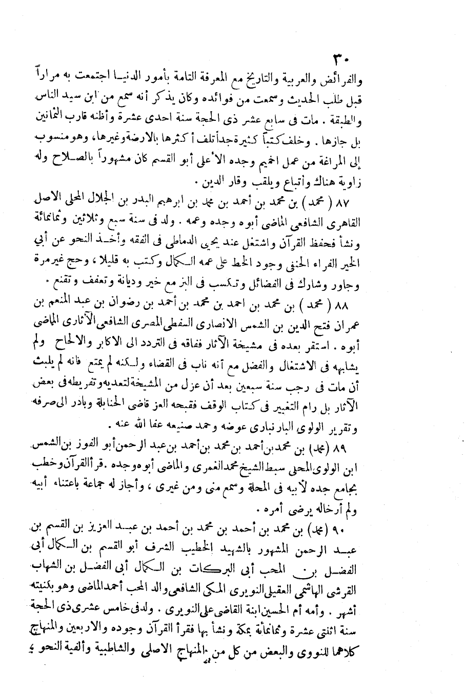 87 - مُحَمَّد بن مُحَمَّد بن أَحْمد بن مُحَمَّد بن إِبْرَاهِيم الْبَدْر بن الْجلَال الْمحلي الأَصْل القاهري الشَّافِعِي / الْمَاضِي أَبوهُ وجده وَعَمه. ولد فِي سنة سبع وَثَلَاثِينَ وَثَمَانمِائَة وَنَشَأ فحفظ الْقُرْآن واشتغل عِنْد يحيى الدماطي فِي الْفِقْه وَأخذ النَّحْو عَن أبي الْخَيْر الْفراء الْحَنَفِيّ وجود الْخط على عَمه الْكَمَال وَكتب بِهِ قَلِيلا، وَحج غير مرّة وجاور وشارك فِي الْفَضَائِل وتكسب فِي الْبَز مَعَ خير وديانة وتعفف وتقنع.