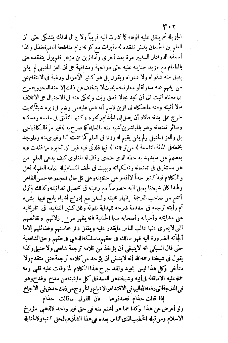 حكايته وعَلى كل حَال فمجموعه حسن الظَّاهِر وَلِهَذَا كَانَ شَيخنَا يمِيل إِلَيْهِ خُصُوصا مَعَ رغبته فِي تَحْصِيل تصانيفه وَكَذَلِكَ لم أزل أسمع من صَاحب التَّرْجَمَة إِظْهَار محبته وَلَكِن مَعَ إدراج أَشْيَاء يلمح فِيهَا بِشَيْء ثمَّ رَأَيْته تَرْجمهُ فِي مُقَدّمَة شَرحه للهداية بقوله وَكَانَ كثير التنكيد فِي تاريخيه على مشايخه وأحبابه وَأَصْحَابه سِيمَا الْحَنَفِيَّة فَإِنَّهُ يظْهر من زلاتهم ونقائصهم الَّتِي لَا يعرى عَنْهَا غَالب النَّاس مَا يقدر عَلَيْهِ ويغفل ذكر محاسنهم وفضائلهم إِلَّا مَا ألجأته الضَّرُورَة إِلَيْهِ فَهُوَ سالك فِي حَقهم مَا سلكه الذَّهَبِيّ فِي حَقهم وَحقّ الشَّافِعِيَّة حَتَّى قَالَ السُّبْكِيّ أَنه لَا يَنْبَغِي أَن يُؤْخَذ من كَلَامه تَرْجَمَة شَافِعِيّ وَلَا حنبلي وَكَذَا يَقُول فِي شَيخنَا رَحمَه الله أَنه لَا يَنْبَغِي أَن يُؤْخَذ من كَلَامه تَرْجَمَة حَنَفِيّ مُتَقَدم وَلَا مُتَأَخّر وكل هَذَا لَيْسَ بجيد وَلَقَد جرح هَذَا الْكَلَام لما وقفت عَلَيْهِ قلبِي وَمَا حمله عَلَيْهِ إِلَّا مَا قَالَه فِي أَبِيه وَشَيخنَا هُوَ الْعُمْدَة فِي كل مَا يُثبتهُ من مدح وقدح وَهُوَ فِي الدرجَة الَّتِي رَفعه الله إِلَيْهَا فِي الِاقْتِدَاء والاتباع وَالْخُرُوج عَن ذَلِك خدش فِي الْإِجْمَاع
