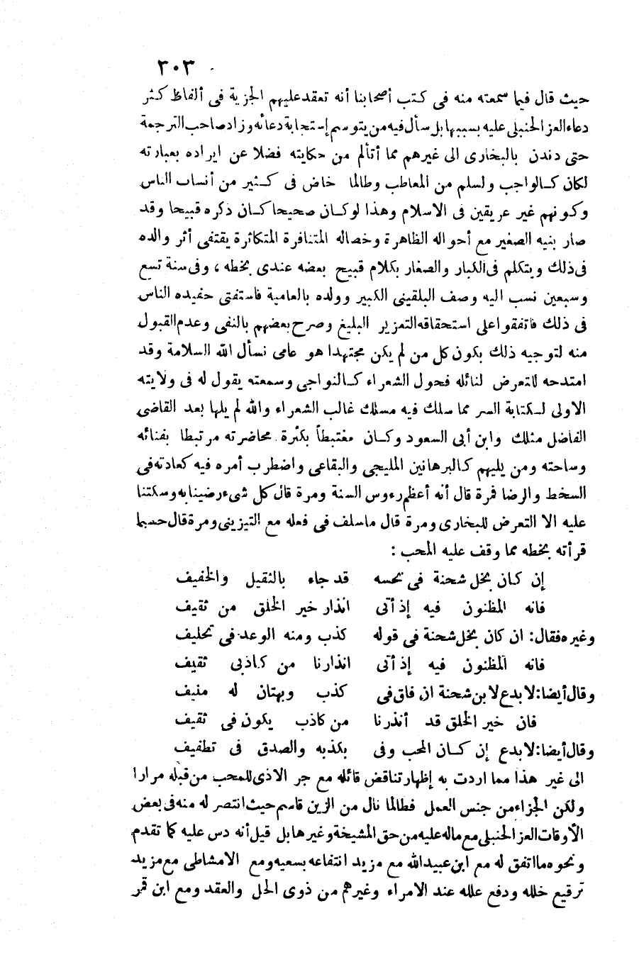 حَيْثُ قَالَ فِيمَا سمعته مِنْهُ فِي كتب أَصْحَابنَا أَنه تعقد عَلَيْهِم الْجِزْيَة فِي أَلْفَاظ كثر دُعَاء الْعِزّ الْحَنْبَلِيّ عَلَيْهِ بِسَبَبِهَا بل سَأَلَ فِيهِ من يتوسم استجابة دُعَائِهِ وَزَاد صَاحب التَّرْجَمَة حَتَّى دندن بالبخاري إِلَى غَيرهم مِمَّا أتألم من حكايته فضلا عَن إِيرَاده بعبارته لَكَانَ كالواجب ولسلم من المعاطب وطالما خَاضَ فِي كثير من أَنْسَاب النَّاس وكونهم غير عريقين فِي الْإِسْلَام وَهَذَا لَو كَانَ صَحِيحا كَانَ ذكره قبيحا وَقد صَار بنيه الصَّغِير مَعَ أَحْوَاله الظَّاهِرَة وخصاله المتنافرة المتكاثرة يقتفي أثر وَالِده فِي ذَلِك وَيتَكَلَّم فِي الْكِبَار وَالصغَار بِكَلَام قَبِيح بعضه عِنْدِي بِخَطِّهِ، وَفِي سنة تسع وَسبعين نسب إِلَيْهِ وصف البُلْقِينِيّ الْكَبِير وَولده بالعامية فاستفتى حفيده النَّاس فِي ذَلِك فاتفقوا على اسْتِحْقَاقه التعزيز البليغ وَصرح بَعضهم بِالنَّفْيِ وَعدم الْقبُول مِنْهُ لتوجيه ذَلِك بِكَوْن كل من لم يكن مُجْتَهدا هُوَ عَامي نسْأَل الله السَّلامَة وَقد امتدحه للتعرض لنائله فحول الشُّعَرَاء كالنواجي وسمعته يَقُول لَهُ فِي ولَايَته الأولى لكتابة السِّرّ مِمَّا سلك فِيهِ مَسْلَك غَالب الشُّعَرَاء وَالله لم يلها بعد القَاضِي الْفَاضِل مثلك وَابْن أبي السُّعُود وَكَانَ مغتبطا بِكَثْرَة محاضرته مرتبطا بفنائه)
