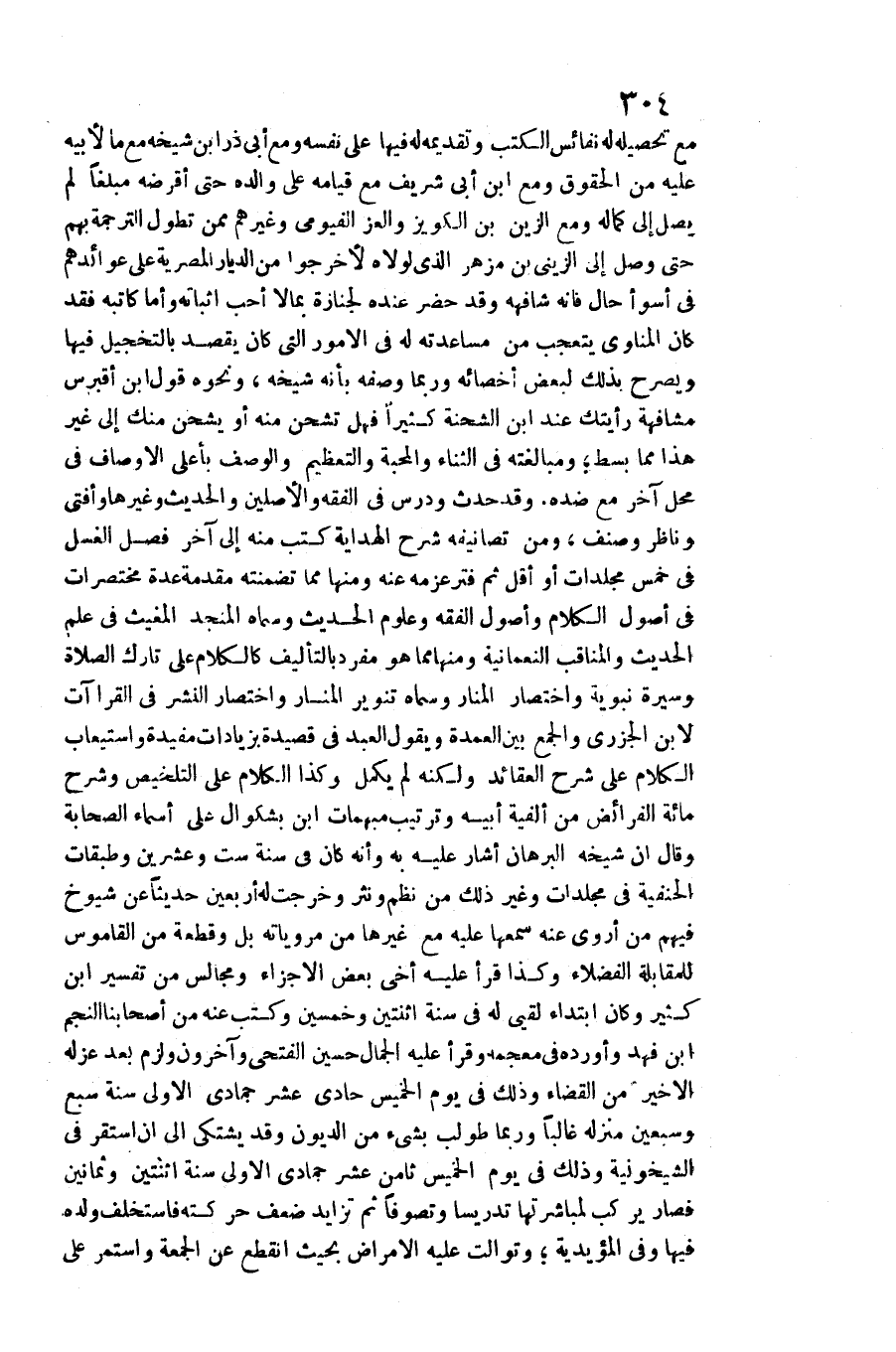 رَأَيْتُك عِنْد ابْن الشّحْنَة كثيرا فَهَل تشحن مِنْهُ أَو يشحن مِنْك إِلَى غير هَذَا مِمَّا بسط ومبالغته فِي الثَّنَاء والمحبة والتعظيم وَالْوَصْف بِأَعْلَى الْأَوْصَاف فِي مَحل آخر مَعَ ضِدّه. وَقد حدث ودرس فِي الْفِقْه والأصلين والْحَدِيث وَغَيرهَا وَأفْتى وناظر وصنف، وَمن تصانيفه شرح الْهِدَايَة كتب مِنْهُ إِلَى آخر فصل الْغسْل فِي خمس مجلدات أَو أقل ثمَّ فتر عزمه عَنهُ وَمِنْهَا مِمَّا تضمنته مُقَدّمَة عدَّة مختصرات فِي أصُول الْكَلَام وأصول الْفِقْه وعلوم الحَدِيث وَسَماهُ المنجد المغيث فِي علم الحَدِيث والمناقب النعمانية وَمِنْهَا مِمَّا هُوَ مُفْرد بالتأليف كَالْكَلَامِ على تَارِك الصَّلَاة وسيرة نبوية واختصار الْمنَار وَسَماهُ تنوير الْمنَار واختصار النشر فِي القراآت لِابْنِ الْجَزرِي وَالْجمع بَين الْعُمْدَة وَيَقُول العَبْد فِي قصيدة بِزِيَادَات مفيدة واستيعاب الْكَلَام على شرح العقائد وَلكنه لم يكمل وَكَذَا الْكَلَام على التَّلْخِيص وَشرح مائَة الْفَرَائِض من ألفية أَبِيه وترتيب مبهمات ابْن بشكوال على أَسمَاء الصَّحَابَة وَقَالَ أَن شَيْخه الْبُرْهَان أَشَارَ عَلَيْهِ بِهِ وَأَنه كَانَ فِي سنة سِتّ وَعشْرين وطبقات الْحَنَفِيَّة فِي مجلدات وَغير ذَلِك من نظم ونثر وَخرجت لَهُ أَرْبَعِينَ حَدِيثا عَن شُيُوخ فيهم من أروى عَنهُ سَمعهَا عَلَيْهِ مَعَ غَيرهَا من مروياته بل وَقطعَة من الْقَامُوس للمقابلة الْفُضَلَاء وَكَذَا قَرَأَ عَلَيْهِ أخي بعض الْأَجْزَاء ومجالس من تَفْسِير ابْن كثير وَكَانَ ابْتِدَاء لقيي لَهُ فِي سنة اثْنَتَيْنِ وَخمسين وَكتب عَنهُ من أَصْحَابنَا النَّجْم ابْن فَهد وَأوردهُ فِي مُعْجَمه وَقَرَأَ عَلَيْهِ الْجمال حُسَيْن الفتحي وَآخَرُونَ وَلزِمَ بعد عَزله الْأَخير من الْقَضَاء وَذَلِكَ فِي يَوْم الْخَمِيس حادي عشر جُمَادَى الأولى سنة سبع وَسبعين منزله غَالِبا وَرُبمَا طُولِبَ بِشَيْء من الدُّيُون وَقد يشتكي إِلَى أَن اسْتَقر فِي الشيخونية وَذَلِكَ فِي يَوْم الْخَمِيس ثامن عشر جُمَادَى الأولى سنة اثْنَتَيْنِ وَثَمَانِينَ فَصَارَ يركب لمباشرتها تدريسا وتصوفا ثمَّ تزايد ضعف حركته فاستخلف وَلَده فِيهَا وَفِي المؤيدية وتوالت عَلَيْهِ الْأَمْرَاض بِحَيْثُ انْقَطع عَن الْجُمُعَة وَاسْتمرّ على