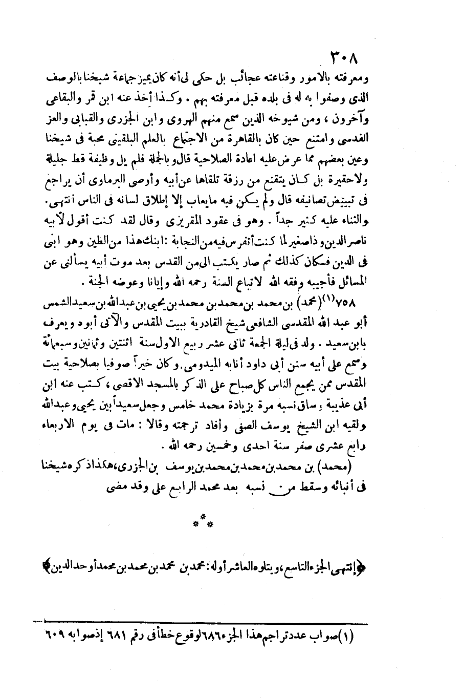 انْتهى الْجُزْء التَّاسِع، ويتلوه الْعَاشِر أَوله: مُحَمَّد بن مُحَمَّد بن مُحَمَّد بن مُحَمَّد أوحد الدّين.