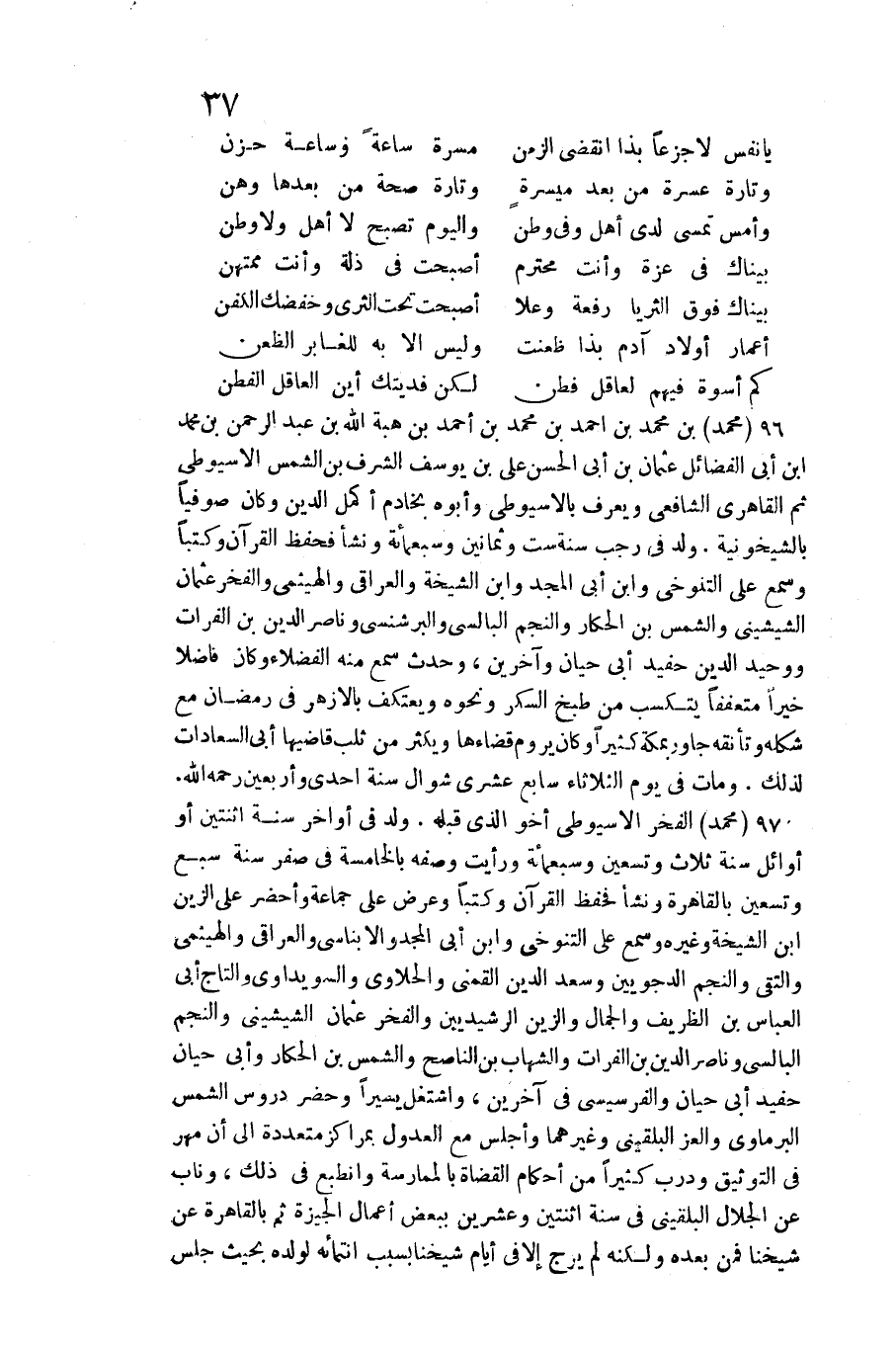 97 - مُحَمَّد الْفَخر الأسيوطي / أَخُو الَّذِي قبله. ولد فِي أَوَاخِر سنة اثْنَتَيْنِ أَو أَوَائِل سنة ثَلَاث وَتِسْعين وَسَبْعمائة وَرَأَيْت وَصفه بالخامسة فِي صفر سنة سبع وَتِسْعين بِالْقَاهِرَةِ وَنَشَأ فحفظ الْقُرْآن وكتبا وَعرض على جمَاعَة وأحضر عَليّ الزين ابْن الشيخة وَغَيره وَسمع عَليّ التنوخي وَابْن أبي الْمجد والابناسي والعراقي والهيثمي والتقي والنجم الدجويين وَسعد الدّين القمني والحلاوي والسويداوي والتاج أبي الْعَبَّاس بن الظريف وَالْجمال والزين الرشيديين وَالْفَخْر عُثْمَان الشيشني والنجم البالسي وناصر الدّين بن الْفُرَات والشهاب بن الناصح وَالشَّمْس بن الحكار وَأبي حَيَّان حفيد أبي حَيَّان والفرسيسي فِي آخَرين، واشتغل يَسِيرا وَحضر دروس الشَّمْس الْبرمَاوِيّ والعز)