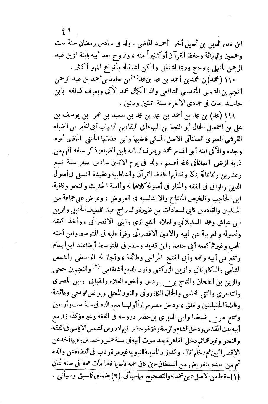 111 - مُحَمَّد بن مُحَمَّد بن أَحْمد بن مُحَمَّد بن مُحَمَّد بن سعيد بن عمر بن يُوسُف بن عَليّ بن اسمعيل الْجمال أَبُو النجا بن الْبَهَاء أبي الْبَقَاء بن الشهَاب أبي الْخَيْر بن الضياء الْقرشِي الْعمريّ الصَّاغَانِي الأَصْل الْمَكِّيّ / قاضيها وَابْن قضاتها الْحَنَفِيّ الْمَاضِي أَبوهُ وجده والآتي ابْنه أَبُو الْقسم مُحَمَّد وَيعرف كسلفه بِابْن الضياء وَذكر سلفه أَنهم من ذُرِّيَّة الرضي الصَّاغَانِي فَالله أعلم. ولد فِي يَوْم الِاثْنَيْنِ سادس صفر سنة تسع وَعشْرين وَثَمَانمِائَة بِمَكَّة وَنَشَأ بهَا فحفظ الْقُرْآن والشاطبية وعقيدة النَّسَفِيّ فِي أصُول الدّين والوافي فِي الْفِقْه والمنار فِي أُصُوله كِلَاهُمَا لَهُ وألفية الحَدِيث والنحو وكافية ابْن الْحَاجِب وتلخيص الْمِفْتَاح والاندلسية فِي الْعرُوض، وَعرض على جمَاعَة من المكيين والقادمين كابي السعادات بن ظهيرة والسراج عبد الطيف الْحَنْبَلِيّ والزين ابْن عَيَّاش وَمُحَمّد الكيلاني والْعَلَاء الشِّيرَازِيّ وَابْني الاقصرائي، وَأخذ الْفِقْه وأصوله والعربية عَن أَبِيه والامين الاقصرائي وَقَرَأَ عَلَيْهِ فِي الْمُتَوَسّط وَابْن أُخْته الْمُحب وَغَيرهم كعمه أبي حَامِد وَابْن قديد وَحضر فِي الْمُتَوَسّط أَيْضا عِنْد ابْن الْهمام وَسمع من أَبِيه وَعَمه وَأبي الْفَتْح المراغي وَطَائِفَة، وَأَجَازَ لَهُ الوَاسِطِيّ وَالشَّمْس الشَّامي والكلوتاتي والزين الزَّرْكَشِيّ وَنور الدّين الشلقامي والنجم بن حجي والزين بن الطَّحَّان والتاج بن بردس وَأَخُوهُ الْعَلَاء والقبابي وَابْن الْمصْرِيّ والتدمري والتقي الفاسي وَالْجمال الكازروني والنور الْمحلي وَيُونُس)