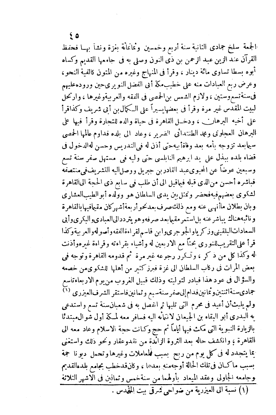 كل من دكر، وتكرر رُجُوعه غير مرّة ثمَّ قدومه الْقَاهِرَة وَتوجه فِي بعض المرات فِي ركاب السُّلْطَان إِلَى غَزَّة فبرز كثير من أَهلهَا للشكوى من خَصمه وَالسُّؤَال فِي عود هَذَا فبادر لتوليته وَذَلِكَ قبيل الْغُرُوب من يَوْم الْأَرْبَعَاء تَاسِع جُمَادَى سنة اثْنَتَيْنِ فدام إِلَى صفر سنة سبع وَثَمَانِينَ فاستقر الشّرف العيزري وَلم يلبث أَن أُعِيد فِي محرم الَّتِي تَلِيهَا ثمَّ انْفَصل بِهِ فِي شعْبَان سنة تسع واستدعى بِهِ البدري أَبُو الْبَقَاء بن الجيعان لإنتمائه إِلَيْهِ فسافر مَعَه لمَكَّة أول شَوَّال مبتدئا بالزيارة النَّبَوِيَّة الَّتِي مكث فِيهَا أَيَّامًا ثمَّ حج وَكَانَت حجَّة الْإِسْلَام وَعَاد مَعَه إِلَى الْقَاهِرَة، وانكشف حَاله بعد الثروة الزَّائِدَة من نقدو عقار وَنَحْو ذَلِك وَاسْتغْنى بِمَا يَتَجَدَّد لَهُ فِي كل يَوْم من ربح بِسَبَب الْمُعَامَلَات وَغَيرهَا وَتحمل ديونا جمة بِسَبَب مَا كَانَ فِي تِلْكَ الْحَالة أوجه مِنْهُ بعْدهَا وَكَانَ قد خطب بِجَامِع بَلَده الْقَدِيم وجامعه الجاولي وَعقد الميعاد بأولهما من سنة خمس وَثَمَانِينَ فِي الْأَشْهر الثَّلَاثَة