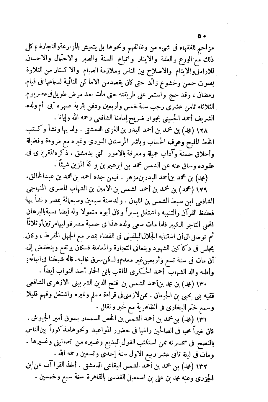 131 - مُحَمَّد بن مُحَمَّد بن أَحْمد الشَّمْس بن الخص / السمسار بسوق أَمِير الجيوش. كَانَ خيرا محبا فِي الصَّالِحين رَاغِبًا فِي حُضُور المواعيد وَنَحْوهَا مَذْكُورا بَين النَّاس بالنصح فِي سمسرته مِمَّن استكتب القَوْل البديع وَغَيره من تصانيفي وَغَيرهَا. وَمَات فِي لَيْلَة ثَانِي عشر ربيع الأول سنة إِحْدَى وَتِسْعين رَحمَه الله.