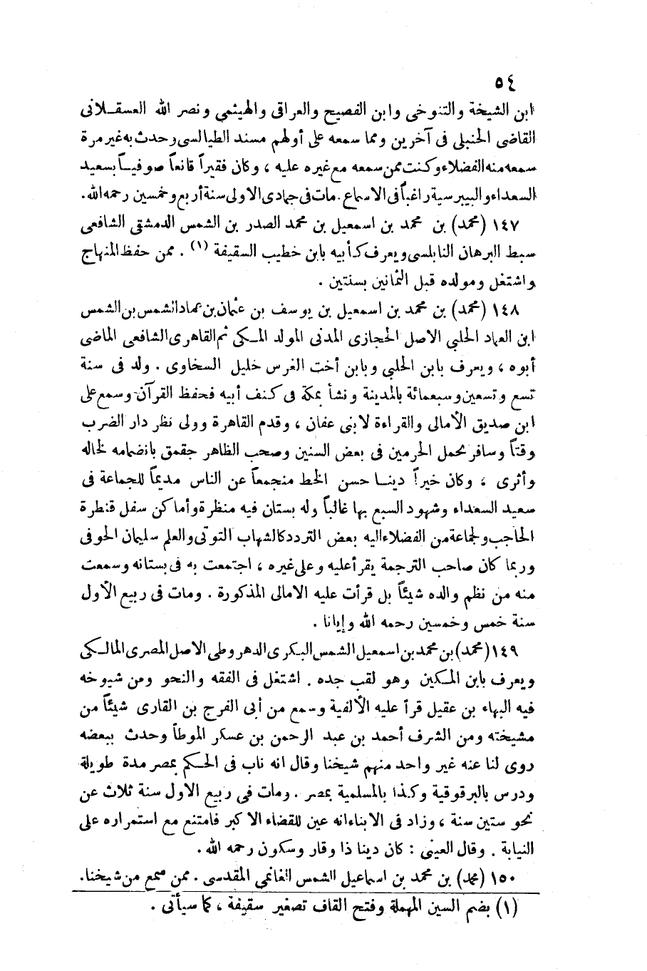 147 - مُحَمَّد بن مُحَمَّد بن اسمعيل بن مُحَمَّد الصَّدْر بن الشَّمْس الدِّمَشْقِي الشَّافِعِي سبط الْبُرْهَان النابلسي وَيعرف كأبيه بِابْن خطيب السَّقِيفَة. / مِمَّن حفظ الْمِنْهَاج واشتغل ومولده قبل الثَّمَانِينَ بِسنتَيْنِ.