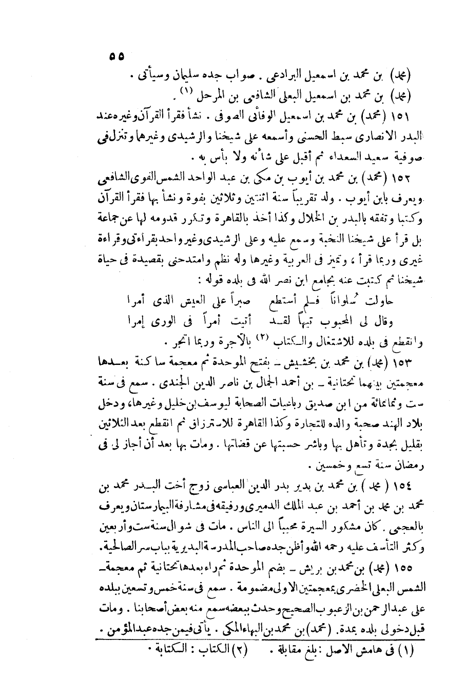 151 - مُحَمَّد بن مُحَمَّد بن اسمعيل الوفائي الصُّوفِي. / نَشأ فَقَرَأَ الْقُرْآن وَغَيره عِنْد الْبَدْر الانصاري)