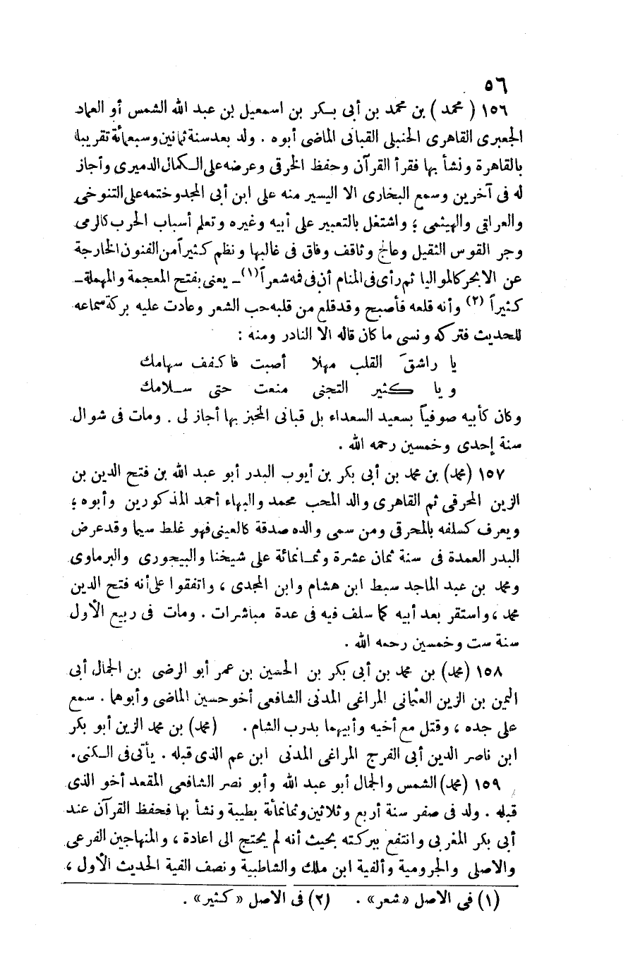 159 - مُحَمَّد الشَّمْس وَالْجمال أَبُو عبد الله وَأَبُو نصر الشَّافِعِي المقعد / أَخُو الَّذِي قبله. ولد فِي صفر سنة أَربع وَثَلَاثِينَ وَثَمَانمِائَة بِطيبَة وَنَشَأ بهَا فحفظ الْقُرْآن عِنْد أبي بكر المغربي وانتفع ببركته بِحَيْثُ أَنه لم يحْتَج إِلَى إِعَادَة، والمنهاجين الفرعي والأصلي والجرومية وألفية ابْن مَالك والشاطبية وَنصف الفية الحَدِيث الأول،