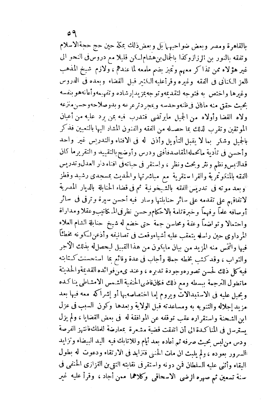 فِي الْفِقْه وَغَيره وَقَرَأَ عَلَيْهِ الْكثير قبل الْقَضَاء وَبعده فِي الدُّرُوس وَغَيرهَا واختص بِهِ فَتوجه لتقديمه وَتوجه بمزيد إرشاده وتفهمه وأعانه هُوَ بِنَفسِهِ بِحَيْثُ حقق مِنْهُ مَا كَانَ فِي ظَنّه وحدسه وبمجرد ترعرعه وَبدر صَلَاحه وَحسن منزعه ولاه القضا وأولاه من الْجَمِيل مَا يرتضي فتدرب فِيهِ بِمن يرد عَلَيْهِ من أَعْيَان الموثقين وتقرب لذَلِك بِمَا حصله من الْفِقْه والفنون والمشار إِلَيْهَا بِالتَّعْيِينِ فَذكر بالجميل وشكر بِنَا لَا يقبل التَّأْوِيل وَأذن لَهُ فِي الافتاء والتدريس غير وَاحِد وَأحسن فِي تأدية مَا تحمله الْمَقَاصِد فَأفْتى ودرس وأوضح بالتقييد والتقرير وَمَا كَانَ قد الْتبس ونظم ونثر وَبحث وَنظر، وَاسْتقر فِي حَيَاته فِي افتاء دَار الْعدْل والتدريس الْفِقْه بالمنكوتمرية والقرا سنقرية مَعَ مباشرتها والْحَدِيث بمسجدي رشيد وقطز وَبعد مَوته فِي التدريس الْفِقْه بالشيخونية ثمَّ فِي الْقَضَاء الْحَنَابِلَة بالديار المصرية لَا تفاقمهم على تقدمه على سَائِر حنابلتها وَسَار فِيهِ أحسن سيرة وترقى فِي سَائِر أَوْصَافه علما وفهما وخبرة تَامَّة بالاحكام وَحسن نظر فِي الْمكَاتب وعقلا ومداراة واحتمالا وتواضعا وعفة ومحاسن جمة حَتَّى خضع لَهُ شيخ حنابلة الشَّام والْعَلَاء المرداوي حِين راسله يتعقب عَلَيْهِ أَشْيَاء وَقعت فِي تصانيفه وأذعن لكَونه مخطئا فِيهَا وَالْتمس مِنْهُ الْمَزِيد من بَيَان مَا يكون من هَذَا الْقَبِيل ليحصل لَهُ بذلك الْأجر وَالثَّوَاب، وَقد كتب بِخَطِّهِ جملَة وَأجَاب فِي عدَّة وقائع بِمَا استحسنت كِتَابَته فِيهِ كل ذَلِك لحسن تصَوره وجودة تدبره، وَعِنْدِي من فَوَائده الْقَدِيمَة والحديثة مَا تطول التَّرْجَمَة ببسطه وَمَعَ ذَلِك فَكَانَ قَاضِي الْحَنَفِيَّة الشَّمْس الامشاطي يناكده ويحيل عَلَيْهِ فِي الاسبدالات ويروم إِمَّا اخْتِصَاصه بهَا أَو إشراكه مَعَه فِيهَا بعد مزِيد إجلاله والتنويه بِهِ مساعدته قبل الْولَايَة وَبعدهَا وَكَون السَّبَب فِي عزل ابْن الشّحْنَة واستقراره عقب توقفه عَن الْمُوَافقَة لَهُ فِي بعض القضايا، وَلم يزل يسترسل فِي المناكدة إِلَى أَن اتّفقت قَضِيَّة مشعرة بمعارضة فانتهز الفرصة ودس من لبس بِحَيْثُ صرفه ثمَّ أَعَادَهُ بعد أَيَّام وللاتابك فِيهِ الْيَد الْبَيْضَاء وتزايد السرُور بعوده، وَلم يلبث أَن مَاتَ الْحَنَفِيّ فتزايد فِي الارتقاء ودعوت لَهُ بطول الْبَقَاء وَأثْنى عَلَيْهِ السُّلْطَان فَمن دونه وَاسْتقر فِي نقابته التقي بن القزازي الْحَنَفِيّ فِي سنة تسعين ثمَّ صهره الرضي الاسحاقي وَكِلَاهُمَا مِمَّن أَجَاد، وَقَرَأَ عَلَيْهِ غير