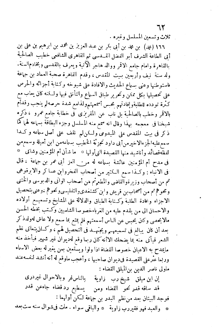 166 - مُحَمَّد بن مُحَمَّد بن أبي بكر بن عبد الْعَزِيز بن مُحَمَّد بن إِبْرَاهِيم بن عَليّ بن أبي طَاعَة الشّرف أَبُو الْفضل الْقُدسِي ثمَّ القاهري الشَّافِعِي خطيب الصالحية بِالْقَاهِرَةِ وَإِمَام جَامع الاقمر ووالد هَاجر الْآتِيَة وَيعرف بالقدسي وبخادم السّنة. / ولد سنة نَيف وَأَرْبَعين بِبَيْت الْمُقَدّس، وَقدم الْقَاهِرَة صُحْبَة الْعِمَاد بن جمَاعَة فاستوطنها وعنى بِسَمَاع الحَدِيث والافادة على شُيُوخه وَكتابه أَجْزَائِهِ والحرص على تَحْصِيلهَا بِكُل مُمكن وتحرير وطباق السماع والتأنق فِيهَا وَلكنه كَانَ يعاب مَعَ كَثْرَة تودده للطلبة وإفادتهم بِحَبْس أسمعتهم ولذامع شدَّة حرصه لم ينجب وَقد أم بالاقمر وخطب بالصالحية بل نَاب عَن المقريزي فِي خطابة جَامع عَمْرو، وَذكره شَيخنَا فِي مُعْجَمه بِهَذَا وَقَالَ أَنه سمع مِنْهُ المسلسل وجزء البطاقة بِسَمَاعِهِ لَهما كَمَا ذكر فِي بَيت الْمُقَدّس عَليّ الْمَيْدُومِيُّ وَلَكِن لم نقف على أصُول سَمَاعه وكدا سمع عَلَيْهِ الْجُزْء الاخير من أبي دَاوُد تجزئة الْخَطِيب بِسَمَاعِهِ من ابْن أميلة وَسمع من لَفظه قصائد وأناشيد مِنْهَا القصيدة الَّتِي أَولهَا مَا شَأْن أم الْمُؤمنِينَ وشابي فِي مدح أم الْمُؤمنِينَ عَائِشَة بِسَمَاعِهِ لَهُ من الْعِزّ أبي عمر بن جمَاعَة، قَالَ فِي الانباء: وَكَذَا سمع الْكثير من أَصْحَاب الْفَخر وَابْن عَسَاكِر وَلَا برقوهي ثمَّ من أَصْحَاب وزيرة القَاضِي والمطعم من أَصْحَاب الواني والدبوسي والختني وَنَحْوهم ثمَّ من أَصْحَاب بن قُرَيْش وَابْن كشتغدي والتفليسي وَنَحْوهم، وعنى بتحصيل الاجزاء وافادة الطّلبَة وَكِتَابَة الطباق وَالدّلَالَة على الْمَشَايِخ وتسميع أَوْلَاده والاحسان إِلَى من يقدم عَلَيْهِ من الغرباء خُصُوصا الشاميين وَكتب بِخَطِّهِ الْحسن مَالا يُحْصى وَكَانَ يحبس عَن الياس أسمعتهم فَلم يمتع بِمَا سمع وَلَا عَاشَ لَهُ ولد ذكر بعد أَن كَانَ يُبَالغ فِي تسميعهم ويجتهد فِي التَّحْصِيل لَهُم، وَكَانَ يتعاني نظم الشّعْر فَيَأْتِي مِنْهُ بِمَا يضْحك إِلَّا أَنه كَانَ رُبمَا وَقع لَهُ ديوَان غير شهير فَيَأْخُذ مِنْهُ مَا يمدح بِهِ الاعيان خُصُوصا الْقُضَاة إِذا ولوا يَسْتَعِين بِمن غير لَهُ بعض الاسماء وَرُبمَا عثر على القصيدة فِي ديوَان صَاحبهَا، وأعجب مَا وَقع لَهُ أَنه أنْشد لنَفسِهِ عِنْد ماولي نَاصِر الدّين بن المليق الْقَضَاء: