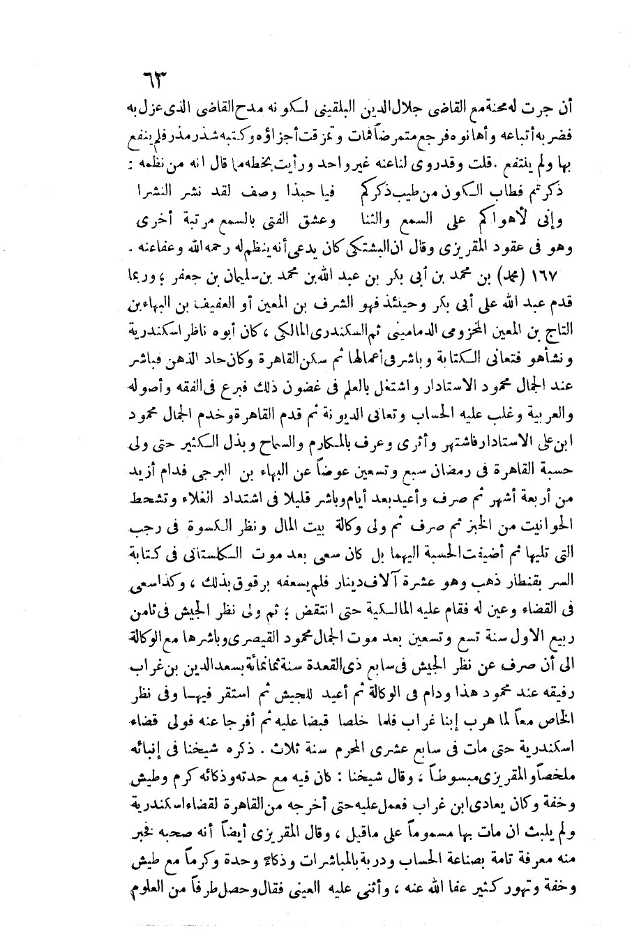 167 - مُحَمَّد بن مُحَمَّد بن أبي بكر بن عبد الله بن مُحَمَّد بن سُلَيْمَان بن جَعْفَر، وَرُبمَا قدم عبد الله على أبي بكر وَحِينَئِذٍ فَهُوَ الشّرف بن الْمعِين أَو الْعَفِيف بن الْبَهَاء بن التَّاج بن الْمعِين المَخْزُومِي الدماميني ثمَّ السكندري الْمَالِكِي، / كَانَ أَبوهُ نَاظر الْإسْكَنْدَريَّة وَنَشَأ هُوَ فتعاني الْكِتَابَة وباشر فِي أَعمالهَا ثمَّ سكن الْقَاهِرَة وَكَانَ حاد الذِّهْن فباشر عِنْد الْجمال مَحْمُود الاستادار واشتغل بِالْعلمِ فِي غُضُون ذَلِك فبرع فِي الْفِقْه وأصوله والعربية وَغلب عَلَيْهِ الْحساب وتعاني الديونة ثمَّ قدم الْقَاهِرَة وخدم الْجمال مَحْمُود ابْن عَليّ الاستادار فاشتهر وأثرى وَعرف بالمكارم والسماح وبذل الْكثير حَتَّى ولي حسبَة الْقَاهِرَة فِي رَمَضَان سبع وَتِسْعين عوضا عَن الْبَهَاء بن الْبُرْجِي فدام أَزِيد من أَرْبَعَة أشهر ثمَّ صرف وأعيد بعد أَيَّام وباشر قَلِيلا فِي اشتداد الغلاء وتشحط الحوانيت من الْخبز ثمَّ صرف ثمَّ ولي وكَالَة بَيت المَال وَنظر الْكسْوَة فِي رَجَب الَّتِي تَلِيهَا ثمَّ أضيفت الْحِسْبَة اليهما بل كَانَ سعي بعد موت الكاستاني فِي كِتَابَة السِّرّ بقناطر ذهب وَهُوَ عشرَة آلَاف دِينَار فَلم يسعفه برقوق بذلك، وَكَذَا سعي فِي الْقَضَاء وَعين لَهُ فَقَامَ عَلَيْهِ الْمَالِكِيَّة حَتَّى انْتقض، ثمَّ ولي نظر الْجَيْش فِي ثامن ربيع الاول سنة تسع وَسِتِّينَ بعد موت الْجمال مَحْمُود القيصري وباشرها مَعَ الْوكَالَة إِلَى أَن صرف عَن نظر الْجَيْش فِي سَابِع ذِي الْقعدَة سنة ثَمَانمِائَة بِسَعْد الدّين بن غراب رَفِيقه عِنْد مَحْمُود هَذَا ودام فِي الْوكَالَة ثمَّ أُعِيد للجيش ثمَّ اسْتَقر فِيهَا وَفِي نظر الْخَاص مَعًا هرب إبنا غراب فَلَمَّا خلصا قبضا عَلَيْهِ أفرجا عَنهُ فولي قَضَاء اسكندرية حَتَّى مَاتَ فِي سَابِع عشري الْمحرم سنة ثَلَاث. ذكره شَيخنَا فِي إبنائه مُلَخصا والمقريزي مَبْسُوطا، وَقَالَ شَيخنَا: كَانَ فِيهِ مَعَ حِدته وذكائه كرم وطيش وخفة وَكَانَ يعادي ابْن غراب فَعمل عَلَيْهِ حَتَّى أخرجه من الْقَاهِرَة لقَضَاء اسكندرية وَلم يلبث أَن مَاتَ بهَا مسموما على مَا قيل، وَقَالَ المقريزي أَيْضا أَنه صَحبه فخبر مِنْهُ معرفَة تَامَّة بصناعة الْحساب)