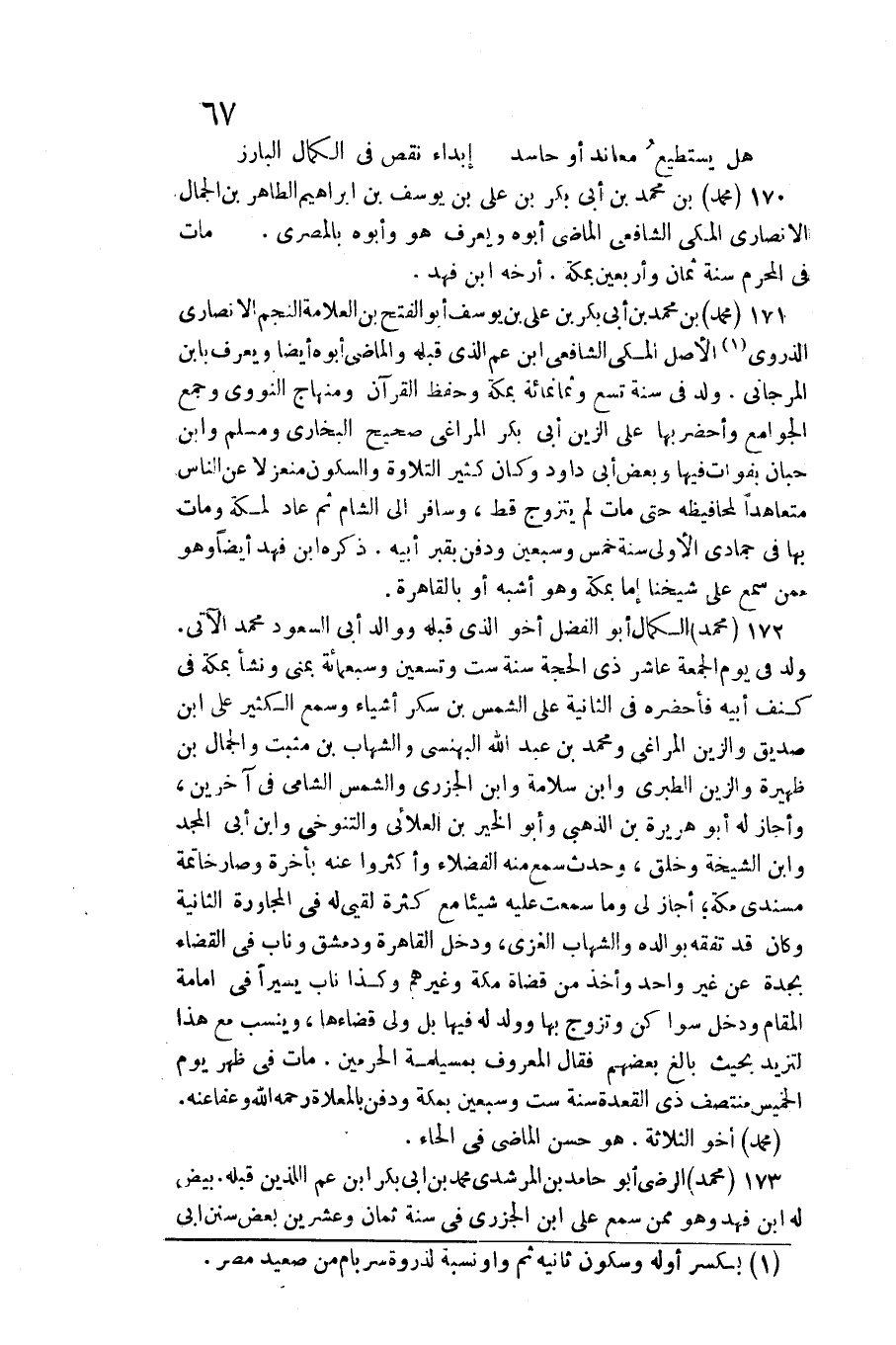 170 - مُحَمَّد بن مُحَمَّد بن أبي بكر بن عَليّ بن يُوسُف بن إِبْرَاهِيم الطَّاهِر بن الْجمال الانصاري الْمَكِّيّ الشَّافِعِي الْمَاضِي أَبوهُ وَيعرف هُوَ أَبوهُ بالمصري. / مَاتَ فِي محرم سنة ثَمَان وَأَرْبَعين بِمَكَّة. أرخه ابْن فَهد.