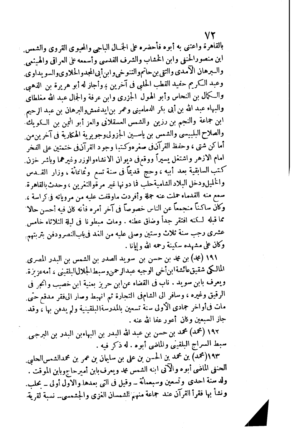 191 - مُحَمَّد بن مُحَمَّد بن حسن بن سُوَيْد الصَّدْر بن الشَّمْس بن الْبَدْر الْمصْرِيّ الْمَالِكِي شَقِيق عَائِشَة بن أخي الْوَجِيه عبد الرَّحْمَن وسبط الْجلَال البُلْقِينِيّ، أمه عزيزة وَيعرف بِابْن سُوَيْد. / نَاب فِي الْقَضَاء عَن ابْن حريز بمنية ابْن خصيب واتجر فِي الرَّقِيق وَغَيره، وسافر إِلَى الشَّام فِي التِّجَارَة ثمَّ نهبط وَصَارَ إِلَى فقر مدعق حَتَّى مَاتَ فِي أَوَاخِر جُمَادَى الأولى سنة تسعين بِالْمَدْرَسَةِ البلقينية وَلم يدْفن بهَا، وَقد جَازَ السّبْعين وَكَانَ أَعور عَفا الله عَنهُ.