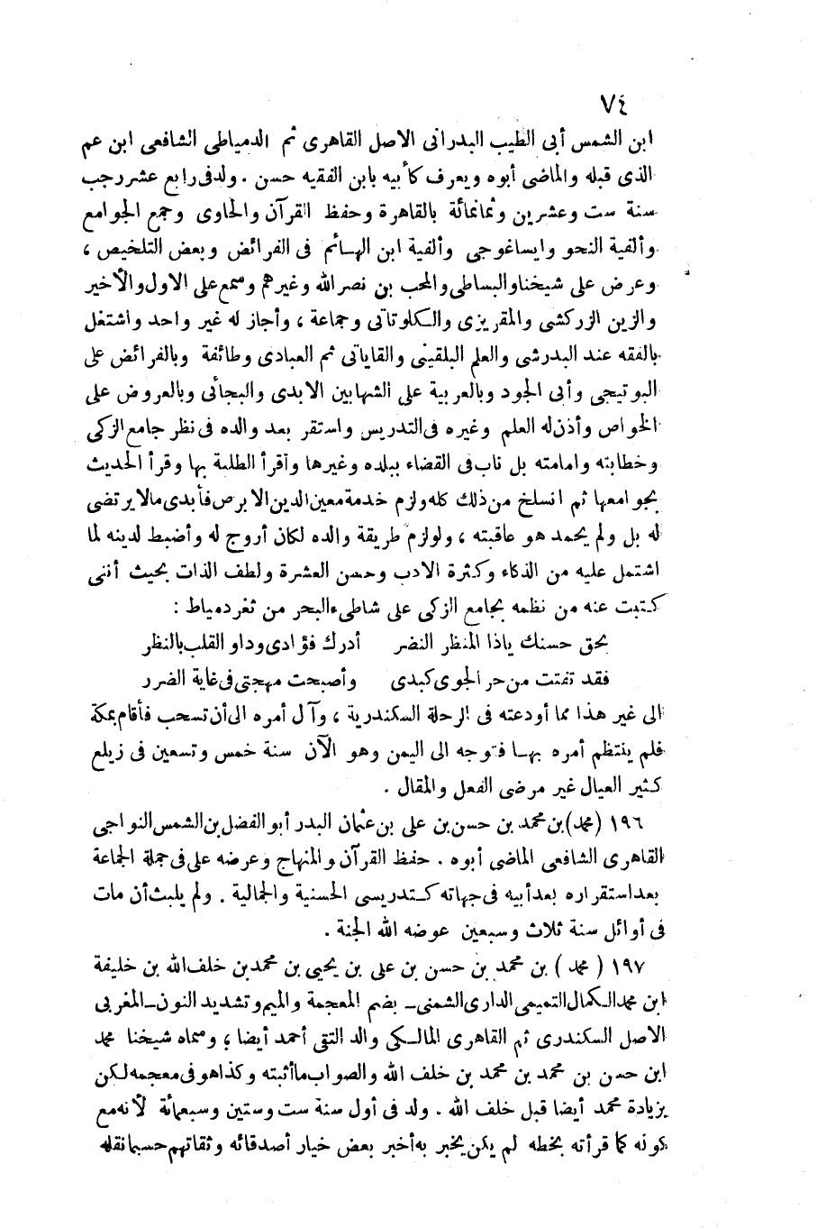 196 - مُحَمَّد بن مُحَمَّد بن حسن بن عَليّ بن عُثْمَان الْبَدْر أَبُو الْفضل بن الشَّمْس النواجي القاهري الشَّافِعِي / الْمَاضِي أَبوهُ. حفظ الْقُرْآن والمناهج وَعرضه عَليّ فِي جملَة الْجَمَاعَة بعد استقراره بعد أَبِيه فِي جهاته كتدريسي الحسنية والجمالية. وَلم يلبث أَن مَاتَ فِي أَوَائِل سنة ثَلَاث وَسبعين عوضه الله الْجنَّة.