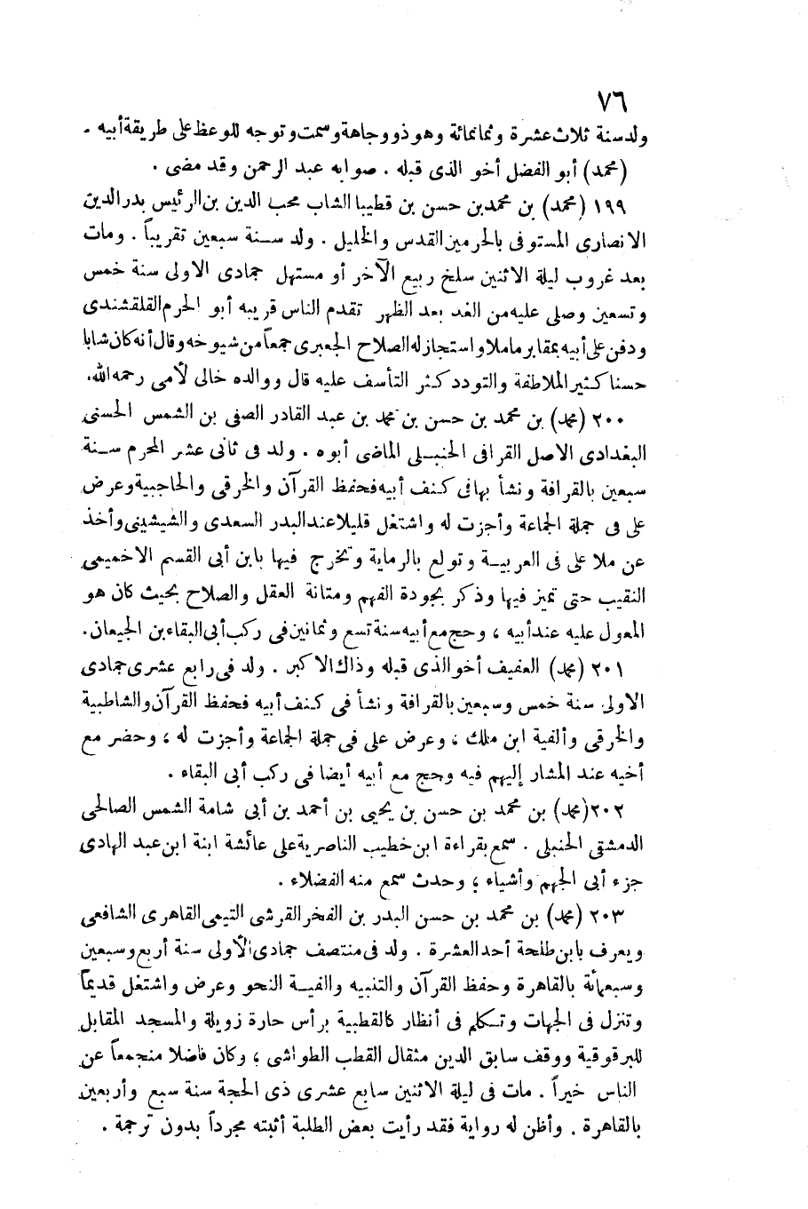 200 - مُحَمَّد بن مُحَمَّد بن حسن بن مُحَمَّد بن عبد الْقَادِر الصفي بن الشَّمْس الحسني الْبَغْدَادِيّ الاصل الْقَرَافِيّ الْحَنْبَلِيّ / الْمَاضِي أَبوهُ. ولد فِي ثَانِي عشر الْمحرم سنة سبعين بالقرافة وَنَشَأ بهَا فِي كنف أَبِيه فحفظ الْقُرْآن والخرقي والحاجبية وَعرض عَليّ فِي جملَة الْجَمَاعَة وأجزت لَهُ واشتغل قَلِيلا عِنْد الْبَدْر السَّعْدِيّ والشيشيني وَأخذ عَن ملا على الْعَرَبيَّة وتولع بالرماية وَتخرج فِيهَا بِابْن أبي الْقسم الاخميمي النَّقِيب حَتَّى تميز فِيهَا وَذكر بجودة الْفَهم ومتانة الْعقل وَالصَّلَاح بِحَيْثُ كَانَ هُوَ الْمعول عَلَيْهِ عِنْد أَبِيه، وَحج مَعَ أَبِيه سنة تسع وَثَمَانِينَ فِي ركب أبي الْبَقَاء بن الجيعان.