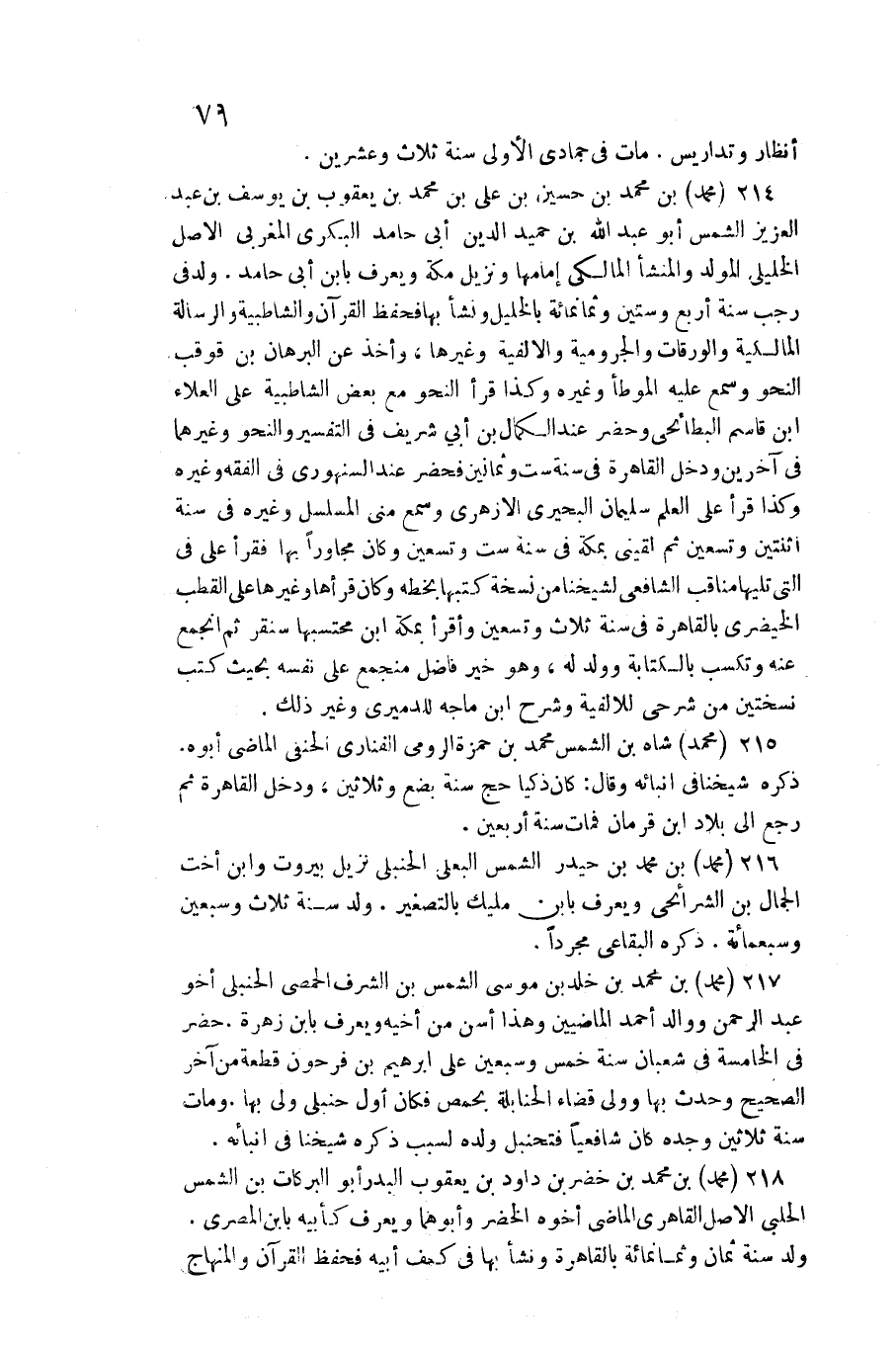 216 - مُحَمَّد بن مُحَمَّد بن حيدر الشَّمْس البعلي الْحَنْبَلِيّ نزيل بيروت وَابْن أُخْت الْجمال بن الشرائحي وَيعرف بِابْن مليك بِالتَّصْغِيرِ. / ولد سنة ثَلَاث وَسبعين وَسَبْعمائة. ذكره البقاعي مُجَردا