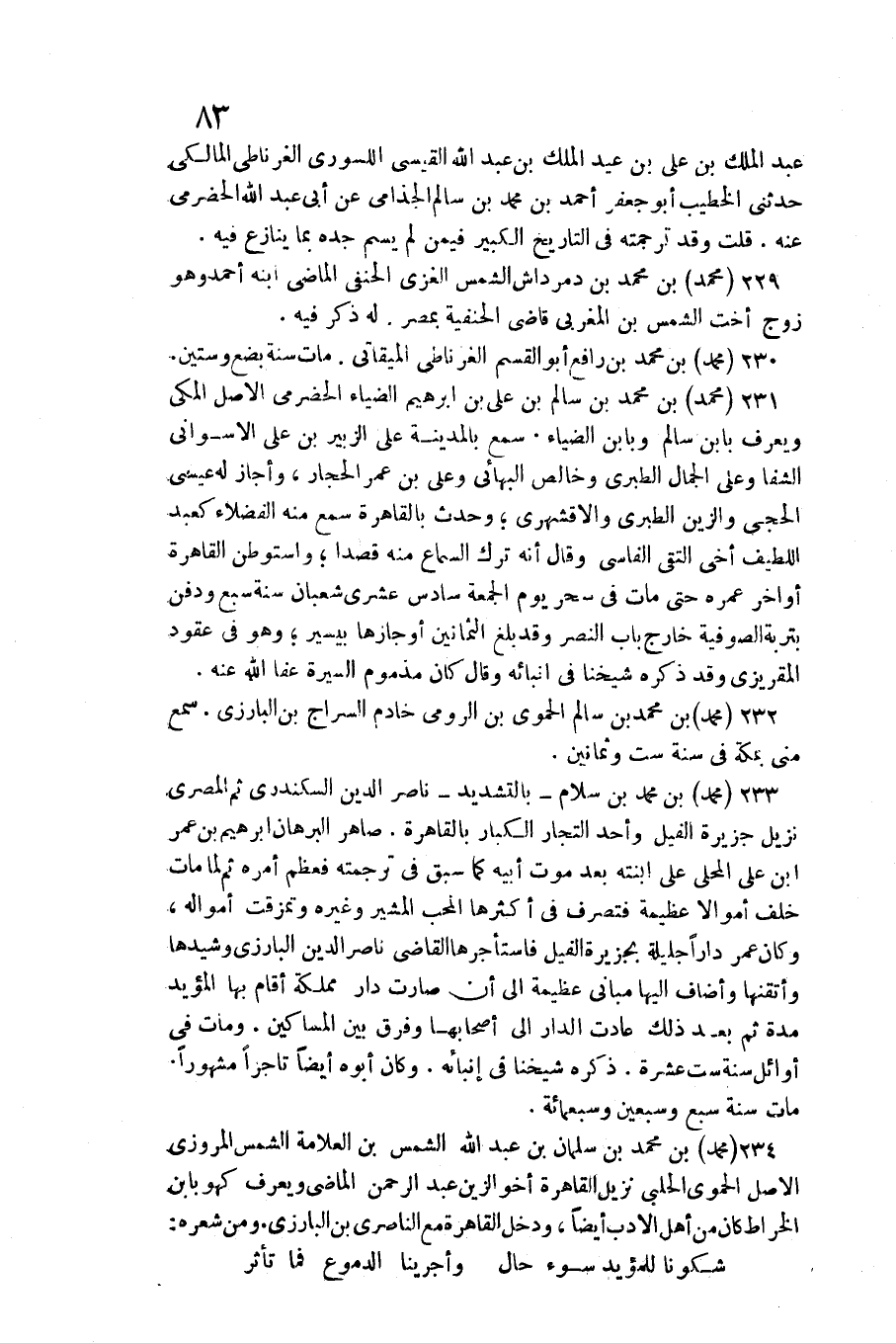 231 - مُحَمَّد بن مُحَمَّد بن سَالم بن عَليّ بن إِبْرَاهِيم الضياء الْحَضْرَمِيّ الاصل الْمَكِّيّ وَيعرف بِابْن سَالم بِابْن الضياء. / سمع بِالْمَدِينَةِ على الزبير بن عَليّ الاسواني الشفا وعَلى الْجمال الطَّبَرِيّ وخالص البهائي وعَلى بن عمر الحجار، وَأَجَازَ لَهُ عِيسَى الحجي والزين الطَّبَرِيّ والاقشهري، وَحدث بِالْقَاهِرَةِ سمع مِنْهُ الْفُضَلَاء كَعبد اللَّطِيف أخي التقي الفاسي وَقَالَ أَنه ترك السماع مِنْهُ قصدا، واستوطن الْقَاهِرَة أَوَاخِر عمره حَتَّى مَاتَ فِي سحر يَوْم الْجُمُعَة سادس عشري شعْبَان سنة سبع وَدفن بتربة الصُّوفِيَّة خَارج بَاب النَّصْر وَقد بلغ الثَّمَانِينَ أَو جازها بِيَسِير، وَهُوَ عُقُود المقريزي وَقد ذكره شَيخنَا فِي انبائه وَقَالَ كَانَ مَذْمُوم السِّيرَة عَفا الله عَنهُ.