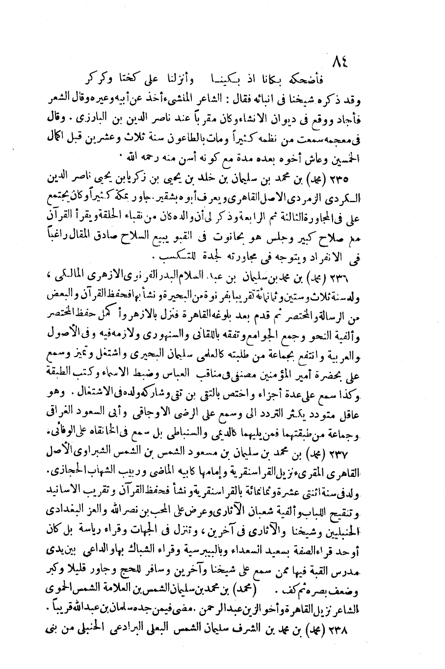 235 - مُحَمَّد بن مُحَمَّد بن سُلَيْمَان بن خلد بن يحيى بن زَكَرِيَّا بن يحيى نَاصِر الدّين الْكرْدِي الزمردي الاصل القاهري وَيعرف أَبوهُ بشقير جاور بِمَكَّة كثيرا / وَكَانَ يجْتَمع على فِي الْمُجَاورَة الثَّالِثَة ثمَّ الرَّابِعَة وَذكر لي أَن وَالِده كَانَ من نقباء الْحلقَة وَيقْرَأ الْقُرْآن مَعَ صَلَاح كَبِير وَجلسَ هُوَ بحانوت فِي القبو يَبِيع السِّلَاح صَادِق الْمقَال رَاغِبًا فِي الِانْفِرَاد وَيتَوَجَّهُ فِي مجاورته لجدة للتكسب.