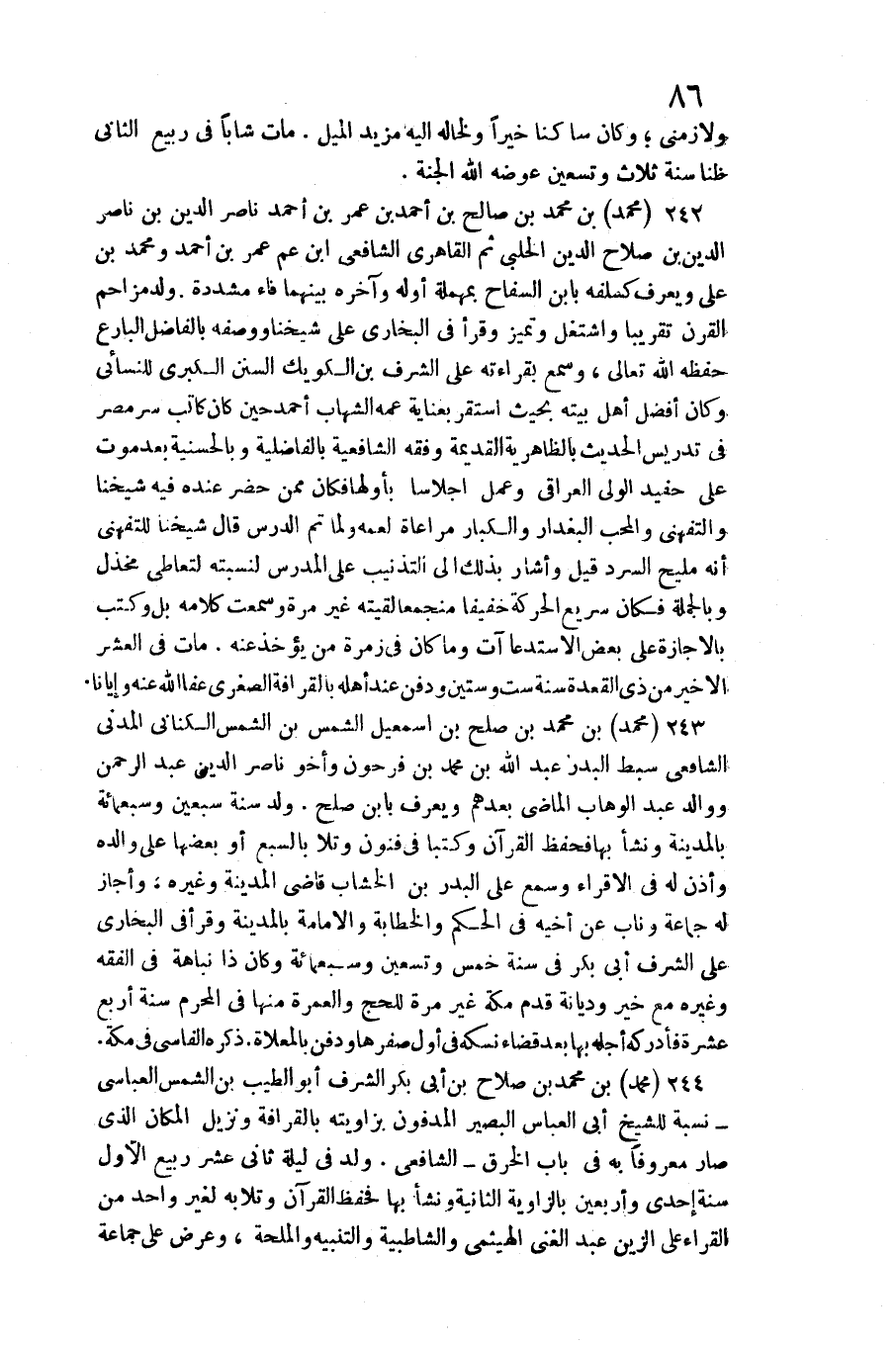 242 - مُحَمَّد بن مُحَمَّد بن صَالح بن أَحْمد بن عمر بن أَحْمد نَاصِر الدّين بن نَاصِر الدّين بن نَاصِر الدّين بن نَاصِر الدّين بن صَلَاح الدّين الْحلَبِي ثمَّ الْقَارِي الشَّافِعِي ابْن عَم عمر بن أَحْمد وَمُحَمّد بن عَليّ وَيعرف كسلفه بِابْن السفاح بِمُهْملَة أَوله وَآخره بَينهمَا فَاء مسددة. / ولد مُزَاحم الْقرن تَقْرِيبًا واشتغل وتميز وَقَرَأَ فِي البُخَارِيّ على شَيخنَا وَصفه بالفاضل البارع حفظه الله تَعَالَى،)