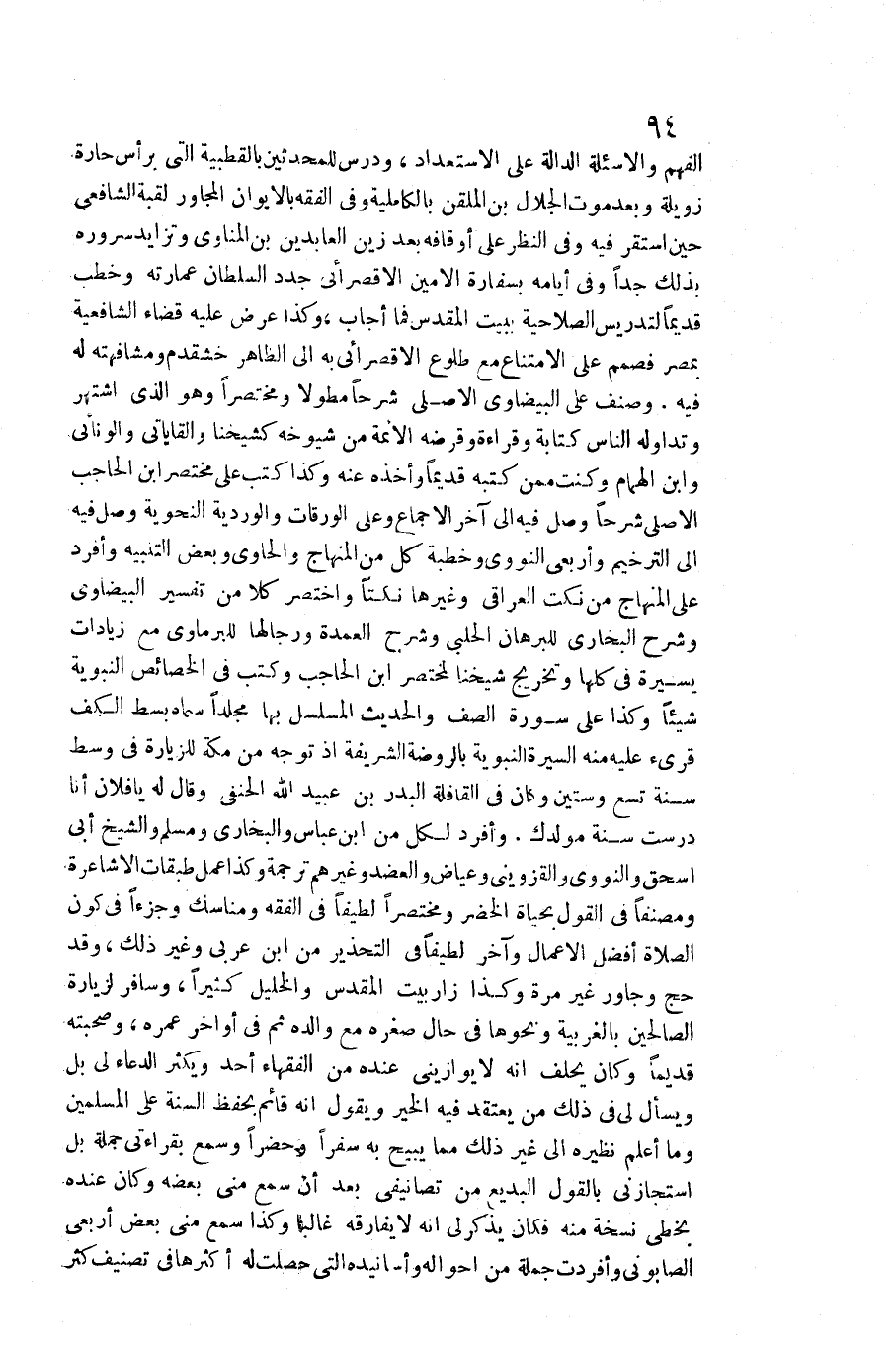 والعضد وَغَيرهم تَرْجَمَة وَكَذَا عمل طَبَقَات الإشاعرة ومصنفا فِي القَوْل بحياة الْخضر ومختصرا لطيفا فِي الْفِقْه ومناسك وجزءا فِي كَون الصَّلَاة أفضل الْأَعْمَال لطيفا فِي التحذير من ابْن عَرَبِيّ وَغير ذَلِك، وَقد حج وجاور غير مرّة وَكَذَا زار بَيت الْمُقَدّس والخليل كثيرا، وسافر لزيارة الصَّالِحين بالغربية وَنَحْوهَا فِي حَال صغره مَعَ وَالِده ثمَّ فِي أَوَاخِر عمره، وصحبته قَدِيما وَكَانَ يحلف أَنه لَا يوازيني عِنْده من الْفُقَهَاء أحد وَيكثر الدُّعَاء لي بل وَيسْأل لي فِي ذَلِك من يعْتَقد فِيهِ الْخَيْر وَيَقُول أَنه قَائِم بِحِفْظ السّنة على الْمُسلمين وَمَا أعلم نَظِيره إِلَى غير ذَلِك مِمَّا يُبِيح بِهِ سفرا وحضرا وَسمع بِقِرَاءَتِي جملَة بل استجازني بالْقَوْل البديع من تصانيفي بعد أَن سمع مني بعضه وَكَانَ عِنْده بخطي نُسْخَة مِنْهُ فَكَانَ يذكر لي أَنه لَا يُفَارِقهُ غَالِبا وَكَذَا سمع مني بعض أربعي الصَّابُونِي وأفردت جملَة من أَحْوَاله وَأَسَانِيده الَّتِي حصلت لَهُ أَكْثَرهَا فِي تصنيف كثر