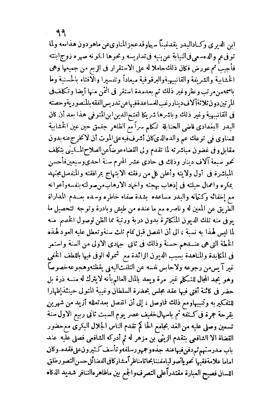 ابْن الديري وَكَاد الْبَدْر يقد غنبا سِيمَا قد عجز الْمَنَاوِيّ عَن ماهو دون هَذَا مَعَه وَلما توفّي عَم وَالِده سعي فِي النِّيَابَة عَن بنيه فِي تداريسه وَنَحْوهَا لكَونه صهره زوج ابْنَته فَأُجِيب ثمَّ عورض فَكَانَ ذَلِك حَامِلا لَهُ على الِاسْتِقْرَار فِي الرّبع من جَمِيعهَا وَهِي الخشابية والشريفه والقانبيهية والبرقوقية ميعادا وتفسيرا ولافتاء بالحسنية وَمَا باسمه من مُرَتّب وَنظر وَغير ذَلِك ثمَّ بعده مُدَّة اسْتَقر فِي الثّمن مِنْهَا أَيْضا وتكلف فِي الْمَرَّتَيْنِ دون ثَلَاثَة آلَاف دِينَار رغب للمساعدة فِيهَا عَن تدريس الْفِقْه بالمنصورية وحصته فِي القانبيهية وَغير ذَلِك وباشرها شَرِيكا لفتح الدّين ابْن المتوفي هَذَا بعد أَن كَانَ الْبَدْر الْبَغْدَادِيّ قَاضِي الْحَنَابِلَة تكلم سرا مَعَ الظَّاهِر جقمق حِين عين الخشابية للمناوي فِي توعك عَم وَالِده الَّذِي كَانَ أشرف فِيهِ على الْمَوْت أَن لاتخرج عَنهُ بِدُونِ مُقَابل وَفِي غُضُون مُبَاشَرَته لما تقدم ولي الْقَضَاء عوضا عَن الصّلاح المكيني بتكليف نَحْو سَبْعَة آلَاف دِينَار وَذَلِكَ فِي حادي عشر الْمحرم سنة إِحْدَى وَسبعين فَأحْسن الْمُبَاشرَة فِي أول ولَايَته وأعلن كل من رفقته الابتهاج بمرافقته والمنفصل مُجْتَهد بمكره واعمال حليته فِي إذهاب بهجته واخماد الارهاب من صولته بِنَفسِهِ وأعوانه مَعَ إخفائه وكتمانه والبدر مساعده بِشدَّة صفاء خاطره وسده بِعَدَمِ المداراة الطَّرِيق عَن الْمعِين لَهُ وناصره مَعَ ماع عِنْده من طيش)