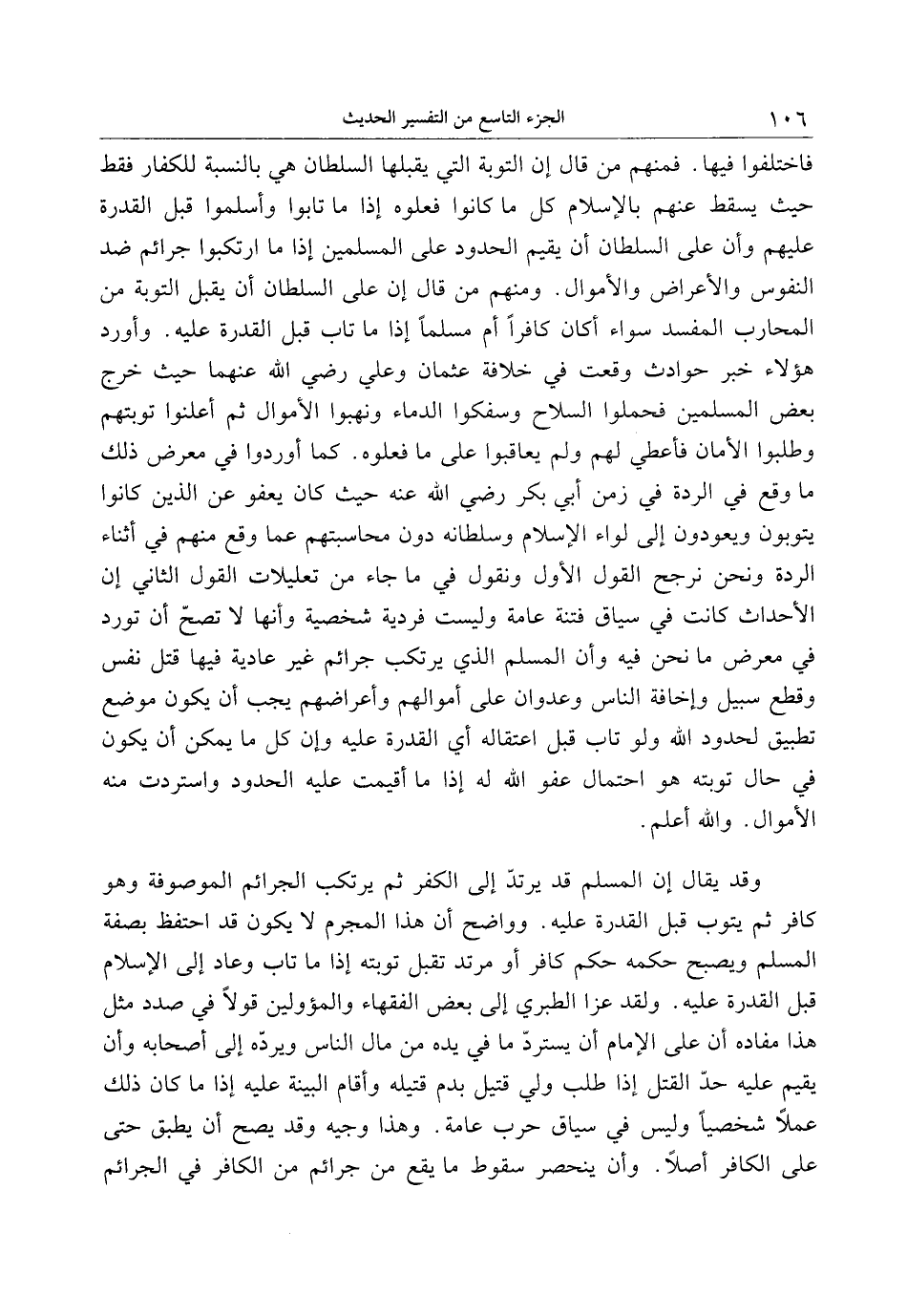 فاختلفوا فيها. فمنهم من قال إن التوبة التي يقبلها السلطان هي بالنسبة للكفار فقط حيث يسقط عنهم بالإسلام كل ما كانوا فعلوه إذا ما تابوا وأسلموا قبل القدرة عليهم وأن على السلطان أن يقيم الحدود على المسلمين إذا ما ارتكبوا جرائم ضد النفوس والأعراض والأموال. ومنهم من قال إن على السلطان أن يقبل التوبة من المحارب المفسد سواء أكان كافرا أم مسلما إذا ما تاب قبل القدرة عليه. وأورد هؤلاء خبر حوادث وقعت في خلافة عثمان وعلي رضي الله عنهما حيث خرج بعض المسلمين فحملوا السلاح وسفكوا الدماء ونهبوا الأموال ثم أعلنوا توبتهم وطلبوا الأمان فأعطي لهم ولم يعاقبوا على ما فعلوه. كما أوردوا في معرض ذلك ما وقع في الردة في زمن أبي بكر رضي الله عنه حيث كان يعفو عن الذين كانوا يتوبون ويعودون إلى لواء الإسلام وسلطانه دون محاسبتهم عما وقع منهم في أثناء الردة ونحن نرجح القول الأول ونقول في ما جاء من تعليلات القول الثاني إن الأحداث كانت في سياق فتنة عامة وليست فردية شخصية وأنها لا تصحّ أن تورد في معرض ما نحن فيه وأن المسلم الذي يرتكب جرائم غير عادية فيها قتل نفس وقطع سبيل وإخافة الناس وعدوان على أموالهم وأعراضهم يجب أن يكون موضع تطبيق لحدود الله ولو تاب قبل اعتقاله أي القدرة عليه وإن كل ما يمكن أن يكون في حال توبته هو احتمال عفو الله له إذا ما أقيمت عليه الحدود واستردت منه الأموال. والله أعلم.