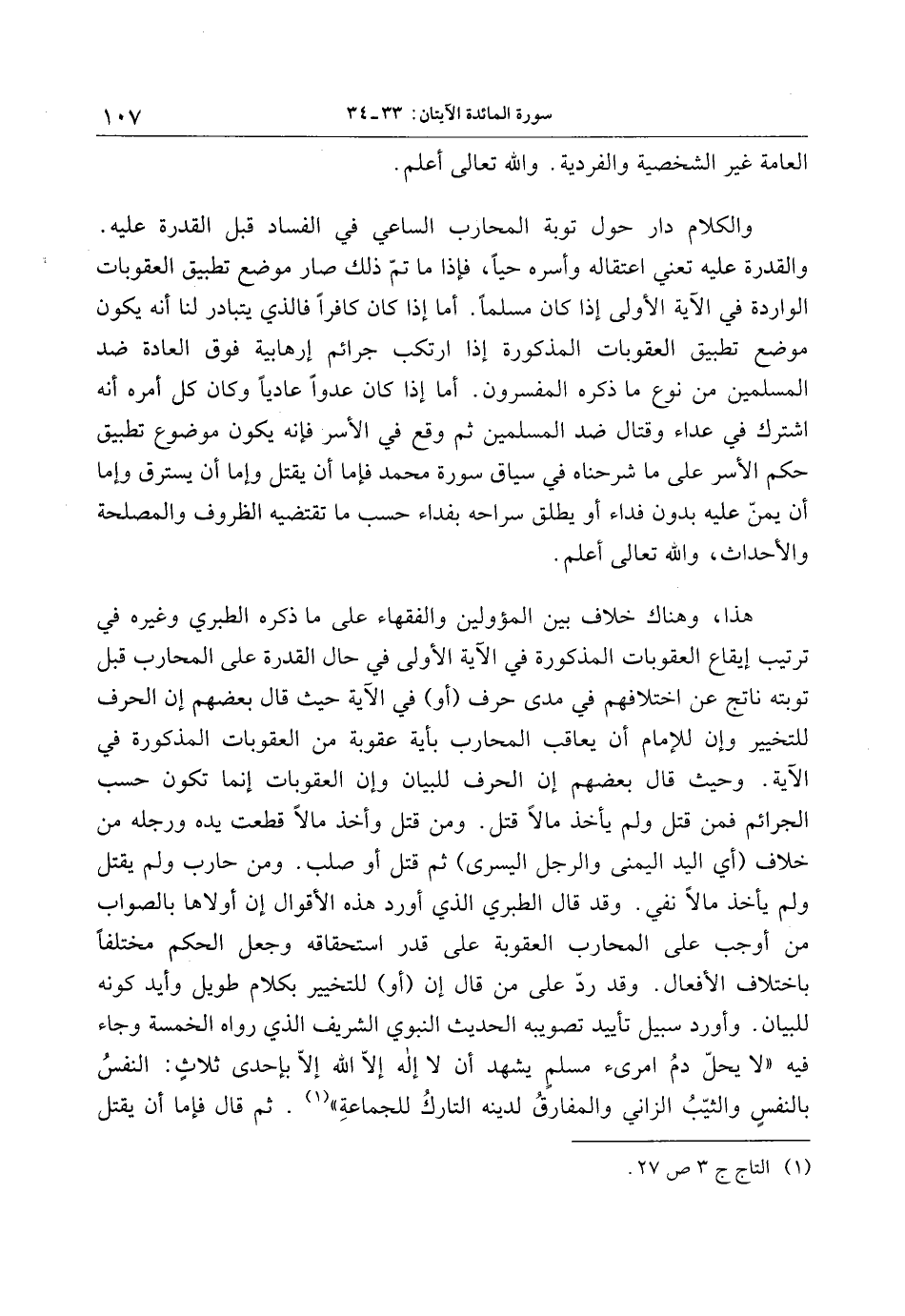 هذا، وهناك خلاف بين المؤولين والفقهاء على ما ذكره الطبري وغيره في ترتيب إيقاع العقوبات المذكورة في الآية الأولى في حال القدرة على المحارب قبل توبته ناتج عن اختلافهم في مدى حرف (أو) في الآية حيث قال بعضهم إن الحرف للتخيير وإن للإمام أن يعاقب المحارب بأية عقوبة من العقوبات المذكورة في الآية. وحيث قال بعضهم إن الحرف للبيان وإن العقوبات إنما تكون حسب الجرائم فمن قتل ولم يأخذ مالا قتل. ومن قتل وأخذ مالا قطعت يده ورجله من خلاف (أي اليد اليمنى والرجل اليسرى) ثم قتل أو صلب. ومن حارب ولم يقتل ولم يأخذ مالا نفي. وقد قال الطبري الذي أورد هذه الأقوال إن أولاها بالصواب من أوجب على المحارب العقوبة على قدر استحقاقه وجعل الحكم مختلفا باختلاف الأفعال. وقد ردّ على من قال إن (أو) للتخيير بكلام طويل وأيد كونه للبيان. وأورد سبيل تأييد تصويبه الحديث النبوي الشريف الذي رواه الخمسة وجاء فيه «لا يحلّ دم امرئ مسلم يشهد أن لا إله إلّا الله إلّا بإحدى ثلاث: النفس بالنفس والثيّب الزاني والمفارق لدينه التارك للجماعة» «1» . ثم قال فإما أن يقتل