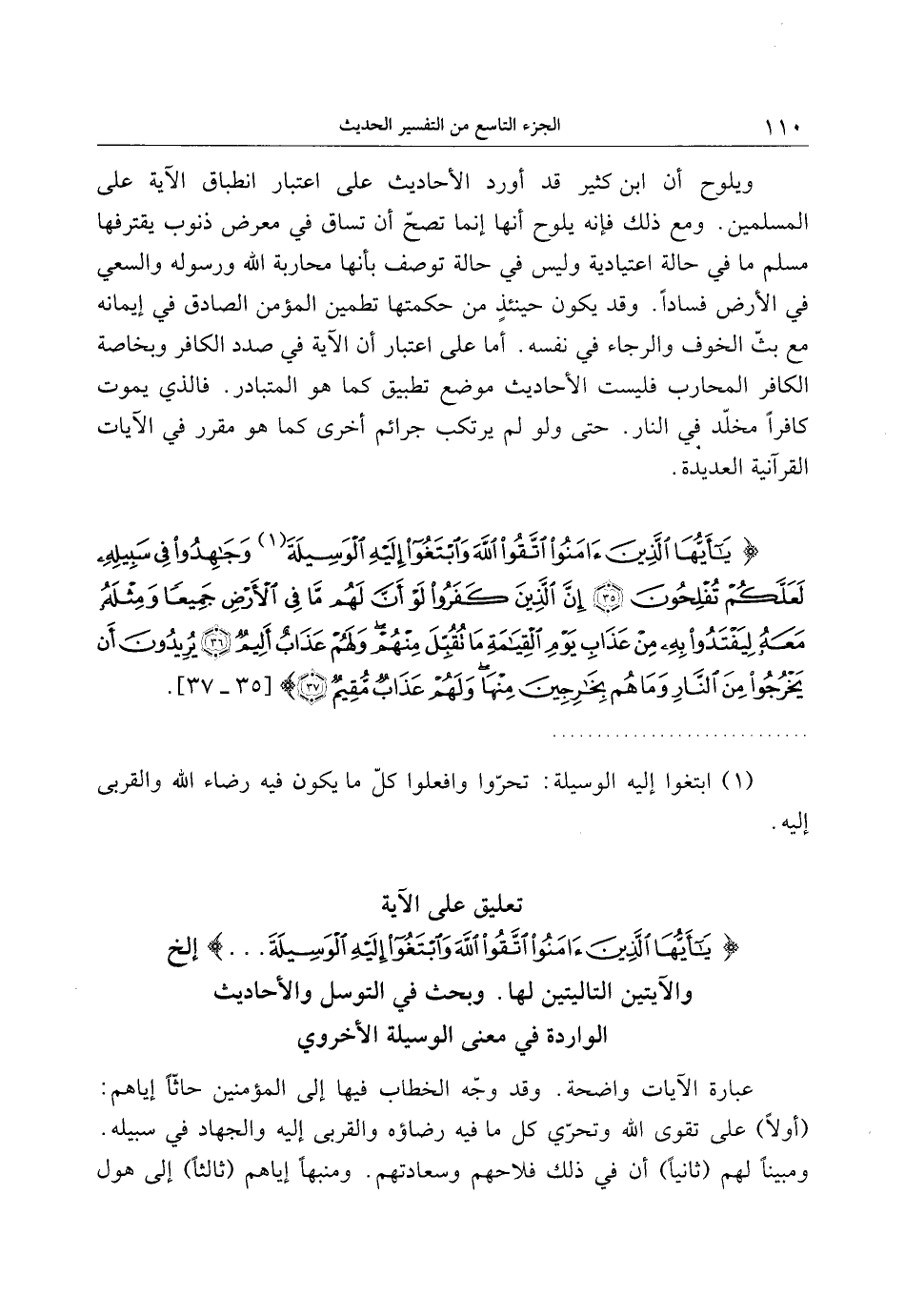 تعليق على الآية يا أَيُّهَا الَّذِينَ آمَنُوا اتَّقُوا اللَّهَ وَابْتَغُوا إِلَيْهِ الْوَسِيلَةَ ... إلخ والآيتين التاليتين لها. وبحث في التوسل والأحاديث الواردة في معنى الوسيلة الأخروي