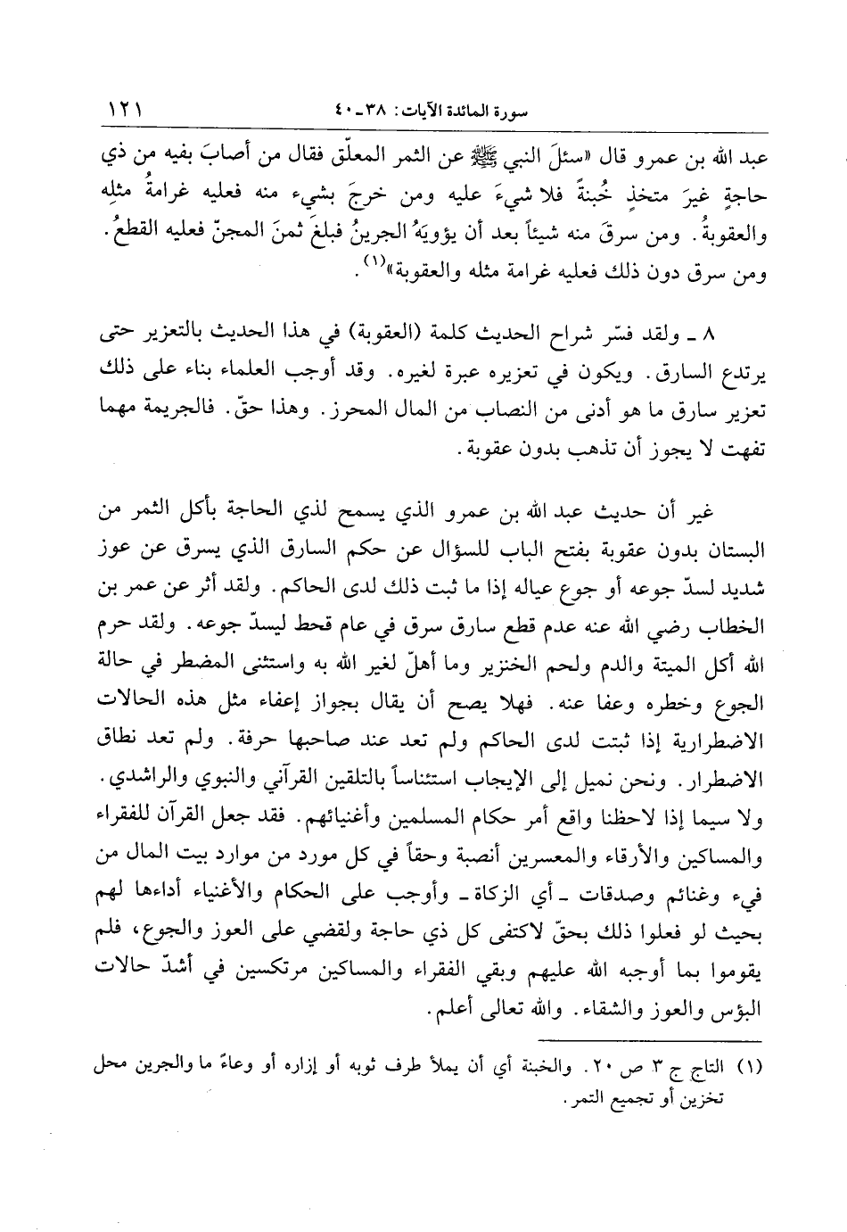 غير أن حديث عبد الله بن عمرو الذي يسمح لذي الحاجة بأكل الثمر من البستان بدون عقوبة بفتح الباب للسؤال عن حكم السارق الذي يسرق عن عوز شديد لسدّ جوعه أو جوع عياله إذا ما ثبت ذلك لدى الحاكم. ولقد أثر عن عمر بن الخطاب رضي الله عنه عدم قطع سارق سرق في عام قحط ليسدّ جوعه. ولقد حرم الله أكل الميتة والدم ولحم الخنزير وما أهلّ لغير الله به واستثنى المضطر في حالة الجوع وخطره وعفا عنه. فهلا يصح أن يقال بجواز إعفاء مثل هذه الحالات الاضطرارية إذا ثبتت لدى الحاكم ولم تعد عند صاحبها حرفة. ولم تعد نطاق الاضطرار. ونحن نميل إلى الإيجاب استئناسا بالتلقين القرآني والنبوي والراشدي.
