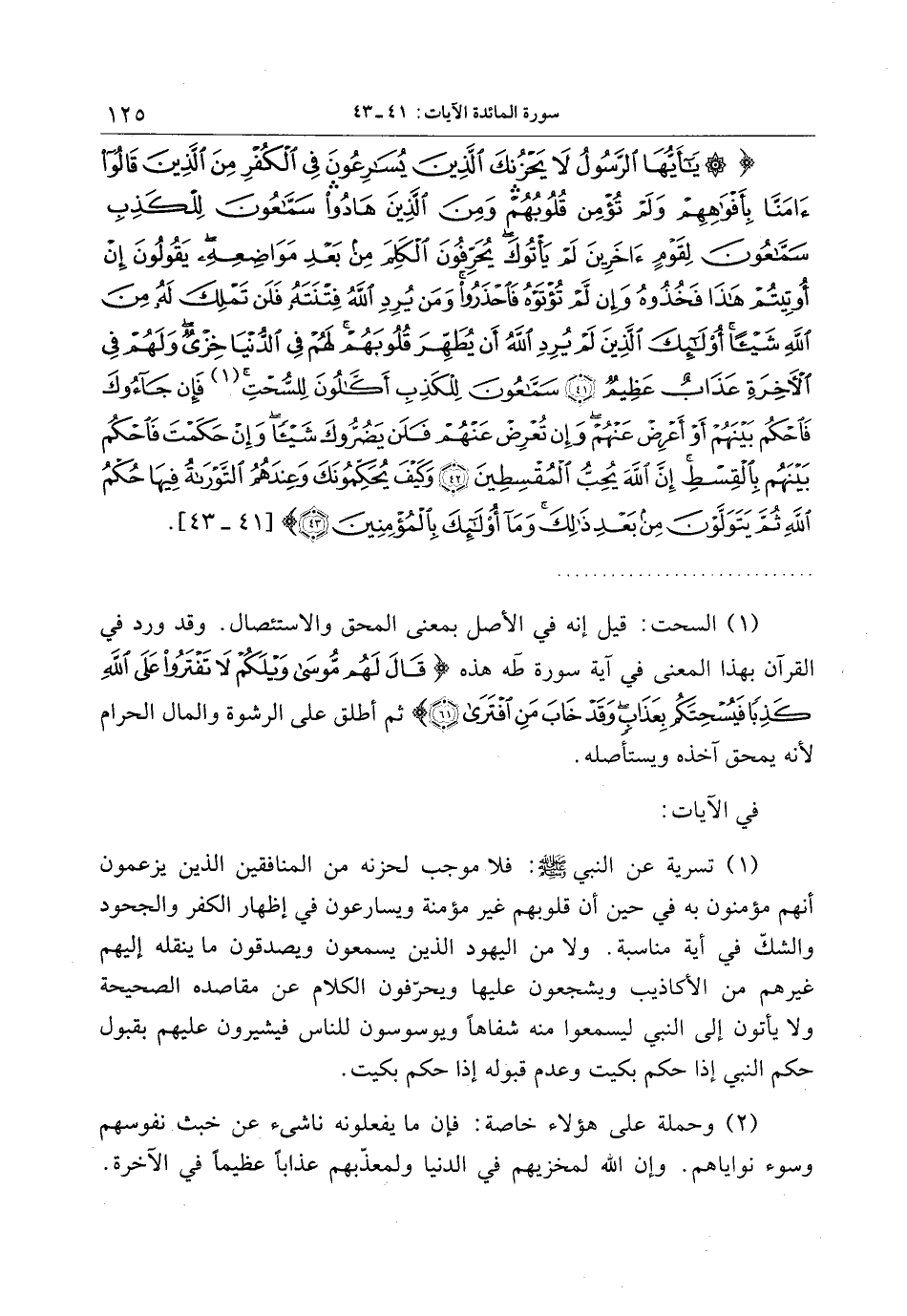 يا أَيُّهَا الرَّسُولُ لا يَحْزُنْكَ الَّذِينَ يُسارِعُونَ فِي الْكُفْرِ مِنَ الَّذِينَ قالُوا آمَنَّا بِأَفْواهِهِمْ وَلَمْ تُؤْمِنْ قُلُوبُهُمْ وَمِنَ الَّذِينَ هادُوا سَمَّاعُونَ لِلْكَذِبِ سَمَّاعُونَ لِقَوْمٍ آخَرِينَ لَمْ يَأْتُوكَ يُحَرِّفُونَ الْكَلِمَ مِنْ بَعْدِ مَواضِعِهِ يَقُولُونَ إِنْ أُوتِيتُمْ هذا فَخُذُوهُ وَإِنْ لَمْ تُؤْتَوْهُ فَاحْذَرُوا وَمَنْ يُرِدِ اللَّهُ فِتْنَتَهُ فَلَنْ تَمْلِكَ لَهُ مِنَ اللَّهِ شَيْئاً أُولئِكَ الَّذِينَ لَمْ يُرِدِ اللَّهُ أَنْ يُطَهِّرَ قُلُوبَهُمْ لَهُمْ فِي الدُّنْيا خِزْيٌ وَلَهُمْ فِي الْآخِرَةِ عَذابٌ عَظِيمٌ (41) سَمَّاعُونَ لِلْكَذِبِ أَكَّالُونَ لِلسُّحْتِ فَإِنْ جاؤُكَ فَاحْكُمْ بَيْنَهُمْ أَوْ أَعْرِضْ عَنْهُمْ وَإِنْ تُعْرِضْ عَنْهُمْ فَلَنْ يَضُرُّوكَ شَيْئاً وَإِنْ حَكَمْتَ فَاحْكُمْ بَيْنَهُمْ بِالْقِسْطِ إِنَّ اللَّهَ يُحِبُّ الْمُقْسِطِينَ (42) وَكَيْفَ يُحَكِّمُونَكَ وَعِنْدَهُمُ التَّوْراةُ فِيها حُكْمُ اللَّهِ ثُمَّ يَتَوَلَّوْنَ مِنْ بَعْدِ ذلِكَ وَما أُولئِكَ بِالْمُؤْمِنِينَ (43)