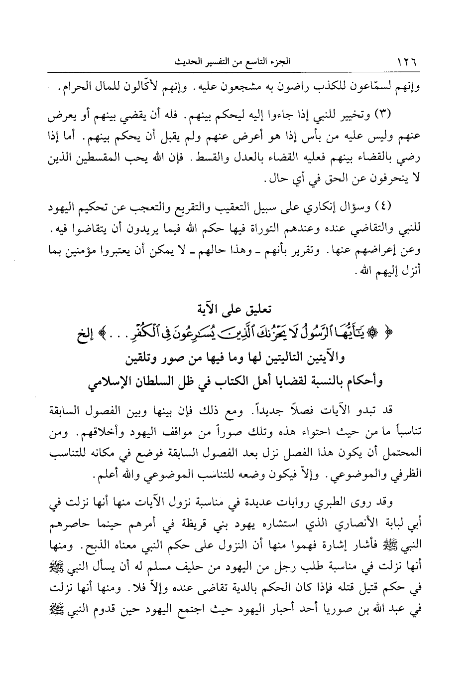 تعليق على الآية يا أَيُّهَا الرَّسُولُ لا يَحْزُنْكَ الَّذِينَ يُسارِعُونَ فِي الْكُفْرِ ... إلخ والآيتين التاليتين لها وما فيها من صور وتلقين وأحكام بالنسبة لقضايا أهل الكتاب في ظل السلطان الإسلامي