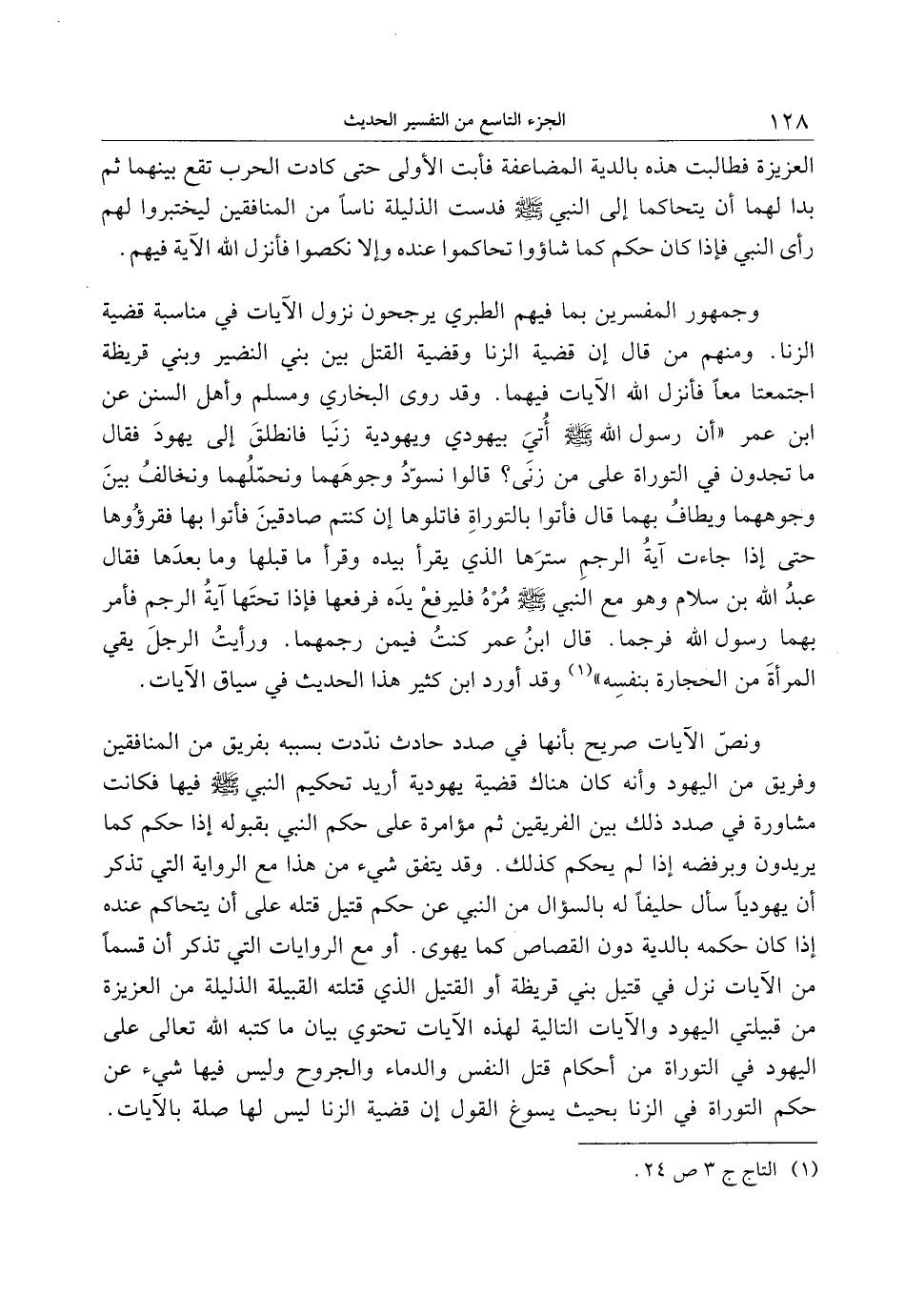 وجمهور المفسرين بما فيهم الطبري يرجحون نزول الآيات في مناسبة قضية الزنا. ومنهم من قال إن قضية الزنا وقضية القتل بين بني النضير وبني قريظة اجتمعتا معا فأنزل الله الآيات فيهما. وقد روى البخاري ومسلم وأهل السنن عن ابن عمر «أن رسول الله صلى الله عليه وسلم أتي بيهودي ويهودية زنيا فانطلق إلى يهود فقال ما تجدون في التوراة على من زنى؟ قالوا نسوّد وجوههما ونحمّلهما ونخالف بين وجوههما ويطاف بهما قال فأتوا بالتوراة فاتلوها إن كنتم صادقين فأتوا بها فقرؤوها حتى إذا جاءت آية الرجم سترها الذي يقرأ بيده وقرأ ما قبلها وما بعدها فقال عبد الله بن سلام وهو مع النبي صلى الله عليه وسلم مره فليرفع يده فرفعها فإذا تحتها آية الرجم فأمر بهما رسول الله فرجما. قال ابن عمر كنت فيمن رجمهما. ورأيت الرجل يقي المرأة من الحجارة بنفسه» «1» وقد أورد ابن كثير هذا الحديث في سياق الآيات.