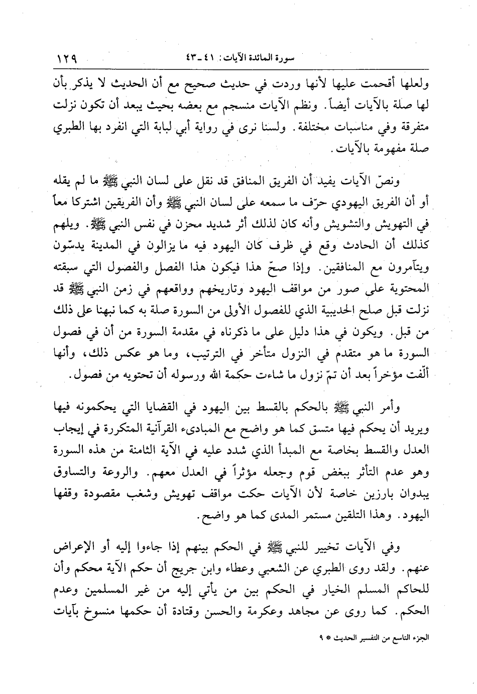 وفي الآيات تخيير للنبي صلى الله عليه وسلم في الحكم بينهم إذا جاءوا إليه أو الإعراض عنهم. ولقد روى الطبري عن الشعبي وعطاء وابن جريج أن حكم الآية محكم وأن للحاكم المسلم الخيار في الحكم بين من يأتي إليه من غير المسلمين وعدم الحكم. كما روى عن مجاهد وعكرمة والحسن وقتادة أن حكمها منسوخ بآيات الجزء التاسع من التفسير الحديث 9