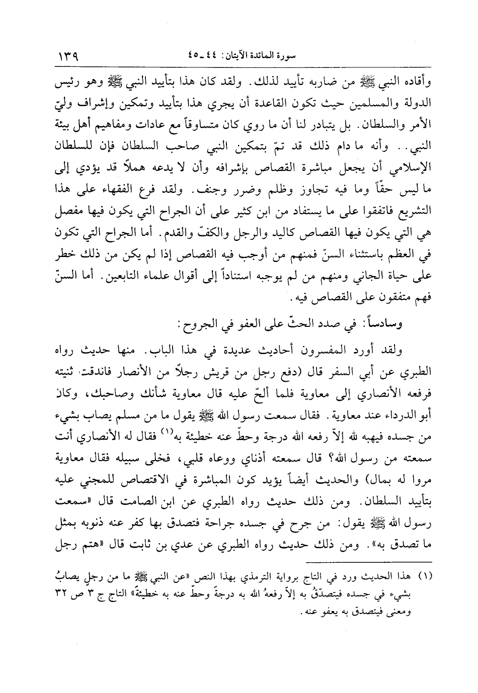 ولقد أورد المفسرون أحاديث عديدة في هذا الباب. منها حديث رواه الطبري عن أبي السفر قال (دفع رجل من قريش رجلا من الأنصار فاندقت ثنيته فرفعه الأنصاري إلى معاوية فلما ألحّ عليه قال معاوية شأنك وصاحبك، وكان أبو الدرداء عند معاوية. فقال سمعت رسول الله صلى الله عليه وسلم يقول ما من مسلم يصاب بشيء من جسده فيهبه لله إلّا رفعه الله درجة وحطّ عنه خطيئة به «1» فقال له الأنصاري أنت سمعته من رسول الله؟ قال سمعته أذناي ووعاه قلبي، فخلى سبيله فقال معاوية مروا له بمال) والحديث أيضا يؤيد كون المباشرة في الاقتصاص للمجني عليه بتأييد السلطان. ومن ذلك حديث رواه الطبري عن ابن الصامت قال «سمعت رسول الله صلى الله عليه وسلم يقول: من جرح في جسده جراحة فتصدق بها كفر عنه ذنوبه بمثل ما تصدق به» . ومن ذلك حديث رواه الطبري عن عدي بن ثابت قال «هتم رجل