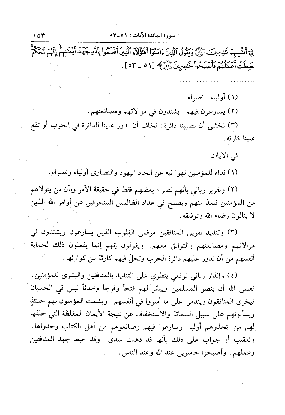 (3) وتنديد بفريق المنافقين مرضى القلوب الذين يسارعون ويشتدون في موالاتهم ومصانعتهم والتواثق معهم. ويقولون إنهم إنما يفعلون ذلك لحماية أنفسهم من أن تدور عليهم دائرة الحرب وتحلّ فيهم كارثة من كوارثها.