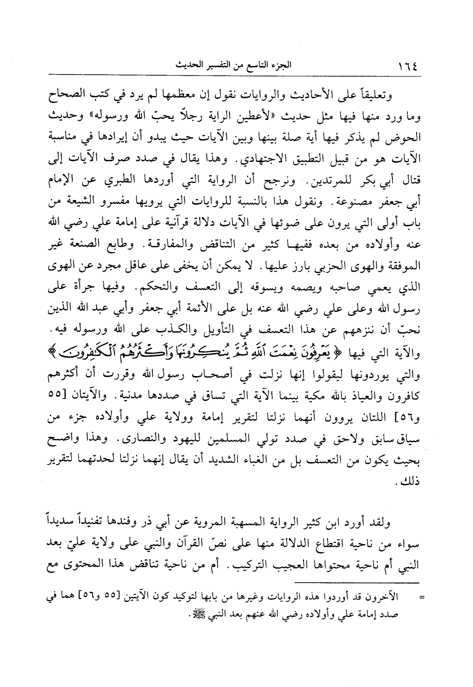 والآية التي فيها يَعْرِفُونَ نِعْمَتَ اللَّهِ ثُمَّ يُنْكِرُونَها وَأَكْثَرُهُمُ الْكافِرُونَ والتي يوردونها ليقولوا إنها نزلت في أصحاب رسول الله وقررت أن أكثرهم كافرون والعياذ بالله مكية بينما الآية التي تساق في صددها مدنية. والآيتان [55 و 56] اللتان يروون أنهما نزلتا لتقرير إمامة وولاية علي وأولاده جزء من سياق سابق ولاحق في صدد تولي المسلمين لليهود والنصارى. وهذا واضح بحيث يكون من التعسف بل من الغباء الشديد أن يقال إنهما نزلتا لحدتهما لتقرير ذلك.