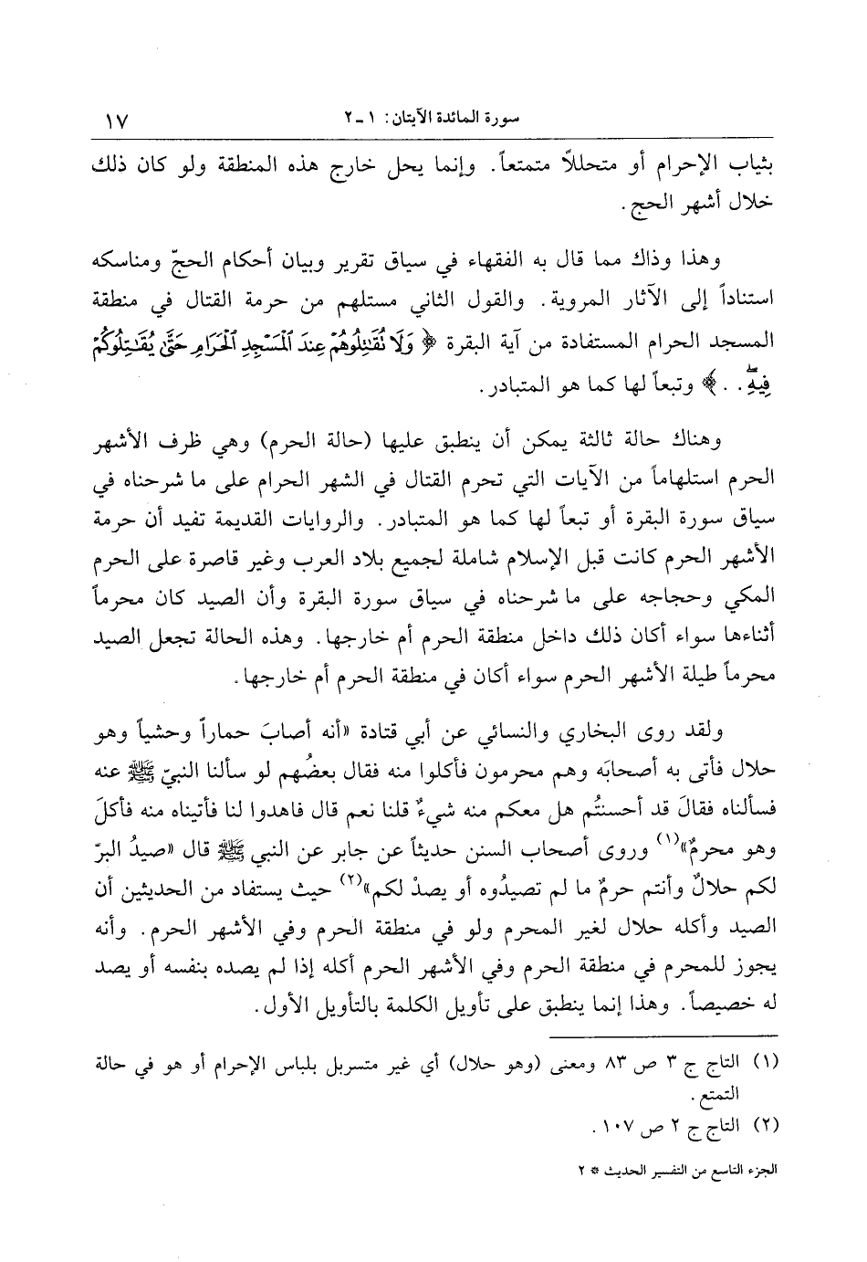 وهذا وذاك مما قال به الفقهاء في سياق تقرير وبيان أحكام الحجّ ومناسكه استنادا إلى الآثار المروية. والقول الثاني مستلهم من حرمة القتال في منطقة المسجد الحرام المستفادة من آية البقرة وَلا تُقاتِلُوهُمْ عِنْدَ الْمَسْجِدِ الْحَرامِ حَتَّى يُقاتِلُوكُمْ فِيهِ.. وتبعا لها كما هو المتبادر.