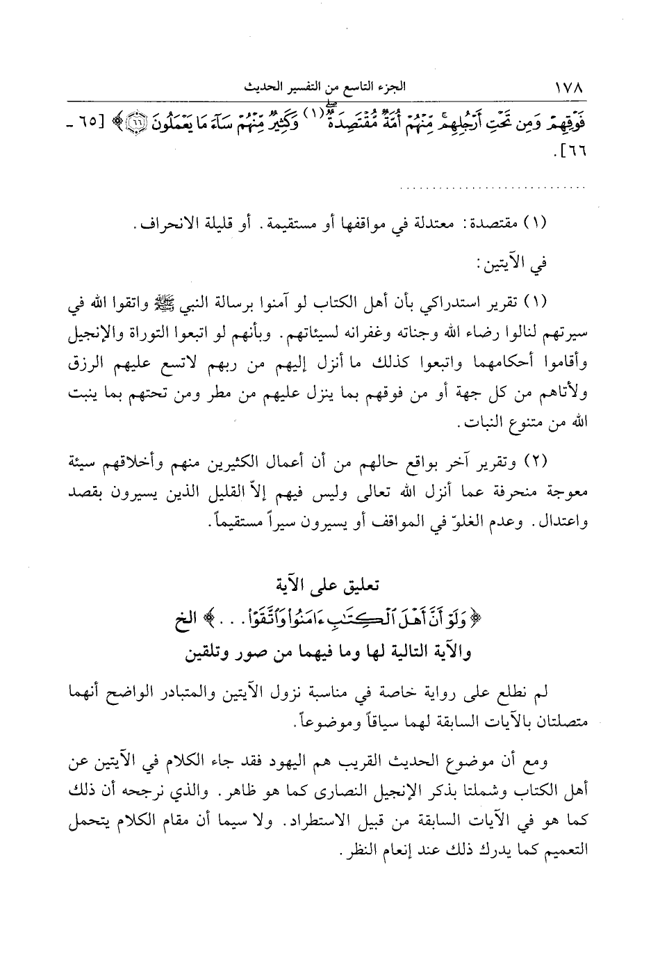 ومع أن موضوع الحديث القريب هم اليهود فقد جاء الكلام في الآيتين عن أهل الكتاب وشملتا بذكر الإنجيل النصارى كما هو ظاهر. والذي نرجحه أن ذلك كما هو في الآيات السابقة من قبيل الاستطراد. ولا سيما أن مقام الكلام يتحمل التعميم كما يدرك ذلك عند إنعام النظر.