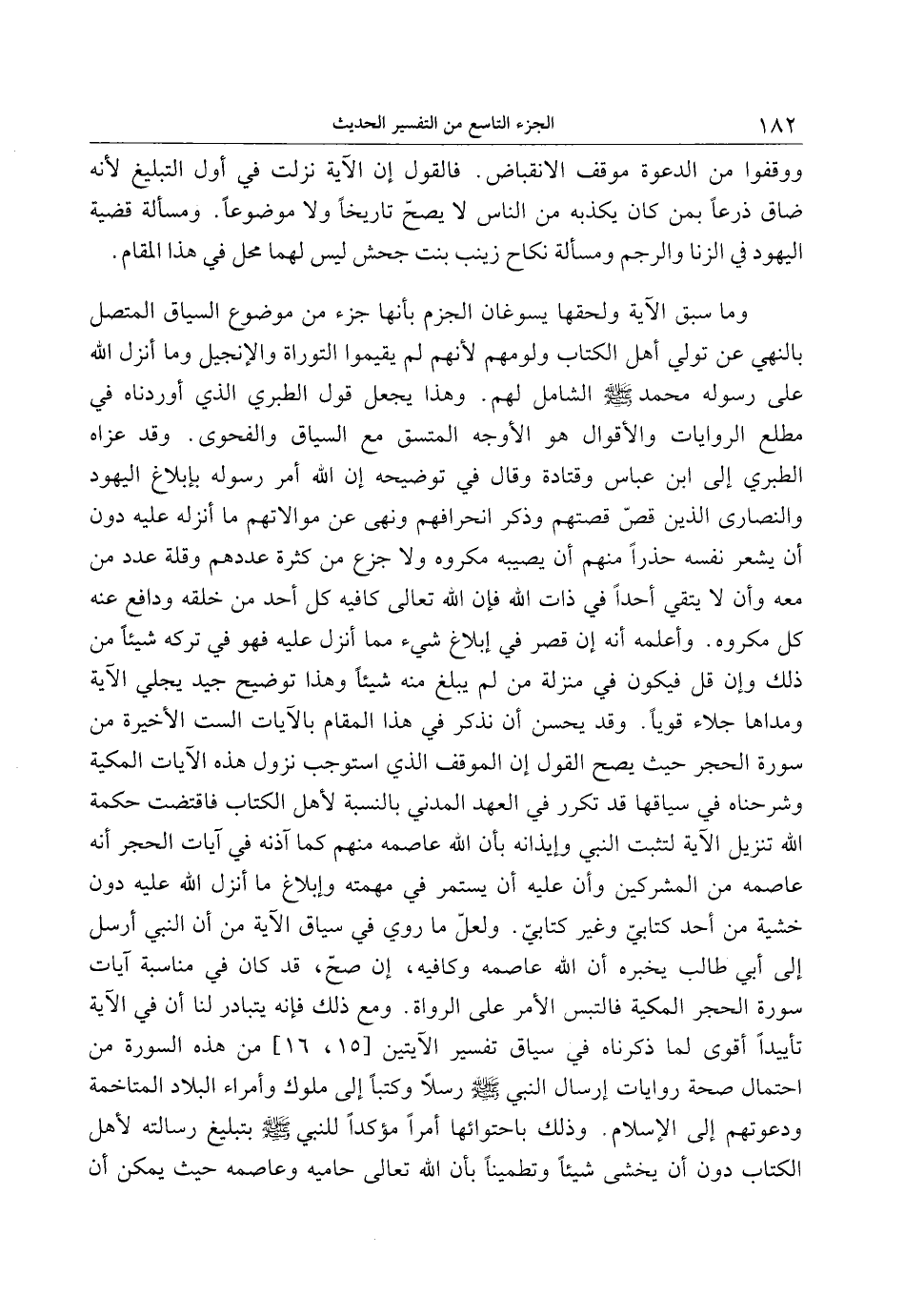 وما سبق الآية ولحقها يسوغان الجزم بأنها جزء من موضوع السياق المتصل بالنهي عن تولي أهل الكتاب ولومهم لأنهم لم يقيموا التوراة والإنجيل وما أنزل الله على رسوله محمد صلى الله عليه وسلم الشامل لهم. وهذا يجعل قول الطبري الذي أوردناه في مطلع الروايات والأقوال هو الأوجه المتسق مع السياق والفحوى. وقد عزاه الطبري إلى ابن عباس وقتادة وقال في توضيحه إن الله أمر رسوله بإبلاغ اليهود والنصارى الذين قصّ قصتهم وذكر انحرافهم ونهى عن موالاتهم ما أنزله عليه دون أن يشعر نفسه حذرا منهم أن يصيبه مكروه ولا جزع من كثرة عددهم وقلة عدد من معه وأن لا يتقي أحدا في ذات الله فإن الله تعالى كافيه كل أحد من خلقه ودافع عنه كل مكروه. وأعلمه أنه إن قصر في إبلاغ شيء مما أنزل عليه فهو في تركه شيئا من ذلك وإن قل فيكون في منزلة من لم يبلغ منه شيئا وهذا توضيح جيد يجلي الآية ومداها جلاء قويا. وقد يحسن أن نذكر في هذا المقام بالآيات الست الأخيرة من سورة الحجر حيث يصح القول إن الموقف الذي استوجب نزول هذه الآيات المكية وشرحناه في سياقها قد تكرر في العهد المدني بالنسبة لأهل الكتاب فاقتضت حكمة الله تنزيل الآية لتثبت النبي وإيذانه بأن الله عاصمه منهم كما آذنه في آيات الحجر أنه عاصمه من المشركين وأن عليه أن يستمر في مهمته وإبلاغ ما أنزل الله عليه دون خشية من أحد كتابيّ وغير كتابيّ. ولعلّ ما روي في سياق الآية من أن النبي أرسل إلى أبي طالب يخبره أن الله عاصمه وكافيه، إن صحّ، قد كان في مناسبة آيات سورة الحجر المكية فالتبس الأمر على الرواة. ومع ذلك فإنه يتبادر لنا أن في الآية تأييدا أقوى لما ذكرناه في سياق تفسير الآيتين [15، 16] من هذه السورة من احتمال صحة روايات إرسال النبي صلى الله عليه وسلم رسلا وكتبا إلى ملوك وأمراء البلاد المتاخمة ودعوتهم إلى الإسلام. وذلك باحتوائها أمرا مؤكدا للنبي صلى الله عليه وسلم بتبليغ رسالته لأهل الكتاب دون أن يخشى شيئا وتطمينا بأن الله تعالى حاميه وعاصمه حيث يمكن أن