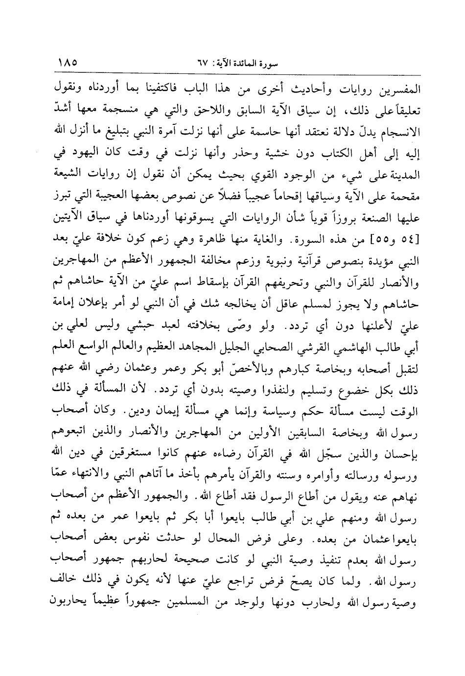 المفسرين روايات وأحاديث أخرى من هذا الباب فاكتفينا بما أوردناه ونقول تعليقا على ذلك، إن سياق الآية السابق واللاحق والتي هي منسجمة معها أشدّ الانسجام يدلّ دلالة نعتقد أنها حاسمة على أنها نزلت آمرة النبي بتبليغ ما أنزل الله إليه إلى أهل الكتاب دون خشية وحذر وأنها نزلت في وقت كان اليهود في المدينة على شيء من الوجود القوي بحيث يمكن أن نقول إن روايات الشيعة مقحمة على الآية وسياقها إقحاما عجيبا فضلا عن نصوص بعضها العجيبة التي تبرز عليها الصنعة بروزا قويا شأن الروايات التي يسوقونها أوردناها في سياق الآيتين [54 و 55] من هذه السورة. والغاية منها ظاهرة وهي زعم كون خلافة عليّ بعد النبيّ مؤيدة بنصوص قرآنية ونبوية وزعم مخالفة الجمهور الأعظم من المهاجرين والأنصار للقرآن والنبي وتحريفهم القرآن بإسقاط اسم عليّ من الآية حاشاهم ثم حاشاهم ولا يجوز لمسلم عاقل أن يخالجه شك في أن النبي لو أمر بإعلان إمامة عليّ لأعلنها دون أي تردد. ولو وصّى بخلافته لعبد حبشي وليس لعلي بن أبي طالب الهاشمي القرشي الصحابي الجليل المجاهد العظيم والعالم الواسع العلم لتقبل أصحابه وبخاصة كبارهم وبالأخصّ أبو بكر وعمر وعثمان رضي الله عنهم ذلك بكل خضوع وتسليم ولنفذوا وصيته بدون أي تردد. لأن المسألة في ذلك الوقت ليست مسألة حكم وسياسة وإنما هي مسألة إيمان ودين. وكان أصحاب رسول الله وبخاصة السابقين الأولين من المهاجرين والأنصار والذين اتبعوهم بإحسان والذين سجّل الله في القرآن رضاءه عنهم كانوا مستغرقين في دين الله ورسوله ورسالته وأوامره وسنته والقرآن يأمرهم بأخذ ما آتاهم النبي والانتهاء عمّا نهاهم عنه ويقول من أطاع الرسول فقد أطاع الله. والجمهور الأعظم من أصحاب رسول الله ومنهم علي بن أبي طالب بايعوا أبا بكر ثم بايعوا عمر من بعده ثم بايعوا عثمان من بعده. وعلى فرض المحال لو حدثت نفوس بعض أصحاب رسول الله بعدم تنفيذ وصية النبي لو كانت صحيحة لحاربهم جمهور أصحاب رسول الله. ولما كان يصحّ فرض تراجع عليّ عنها لأنه يكون في ذلك خالف وصية رسول الله ولحارب دونها ولوجد من المسلمين جمهورا عظيما يحاربون