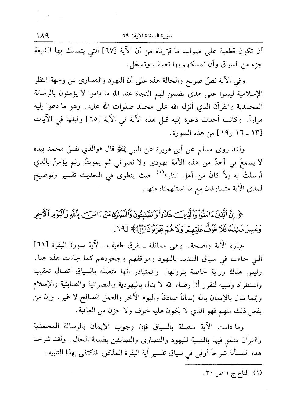 وما دامت الآية متصلة بالسياق فإن وجوب الإيمان بالرسالة المحمدية والقرآن منطو فيها بالنسبة لليهود والنصارى والصابئين بطبيعة الحال. ولقد شرحنا هذه المسألة شرحا أوفى في سياق تفسير آية البقرة المذكور فنكتفي بهذا التنبيه.